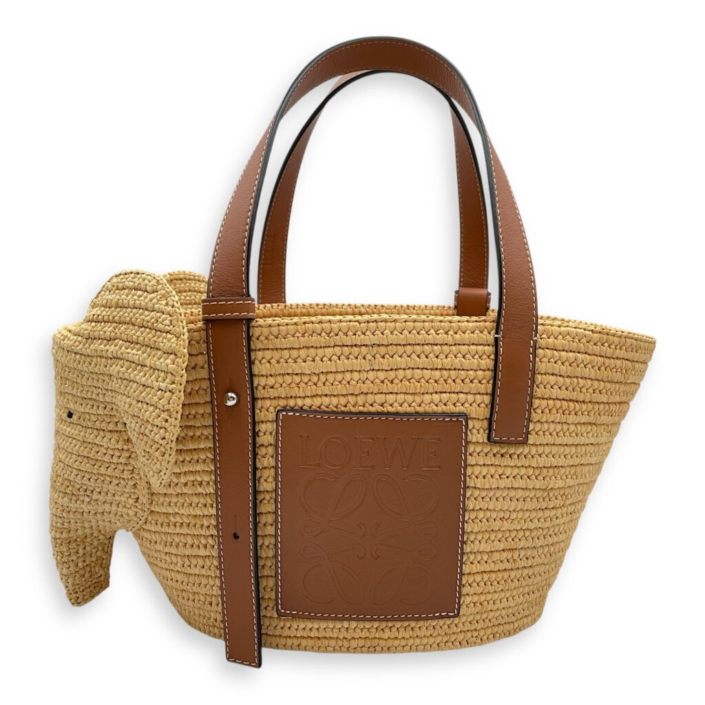 Elephant Basket Small Beige Top Handle Bag in Raffia/Calfskin, Silver hardware