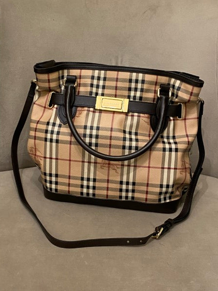 • Material: Haymarket Check Coated Canvas and Brown Leather Trim