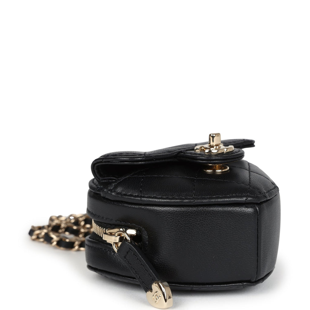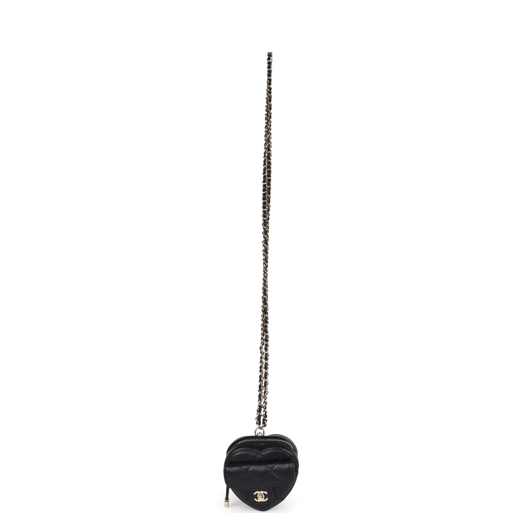 Chanel CC In Love Heart Necklace Bag Black Lambskin Light Gold Hardware Shop for an authentic Chanel CC In Love Heart Necklace Bag in black lambskin leather with light gold tone hardware in never worn condition at Madison Avenue Couture.
