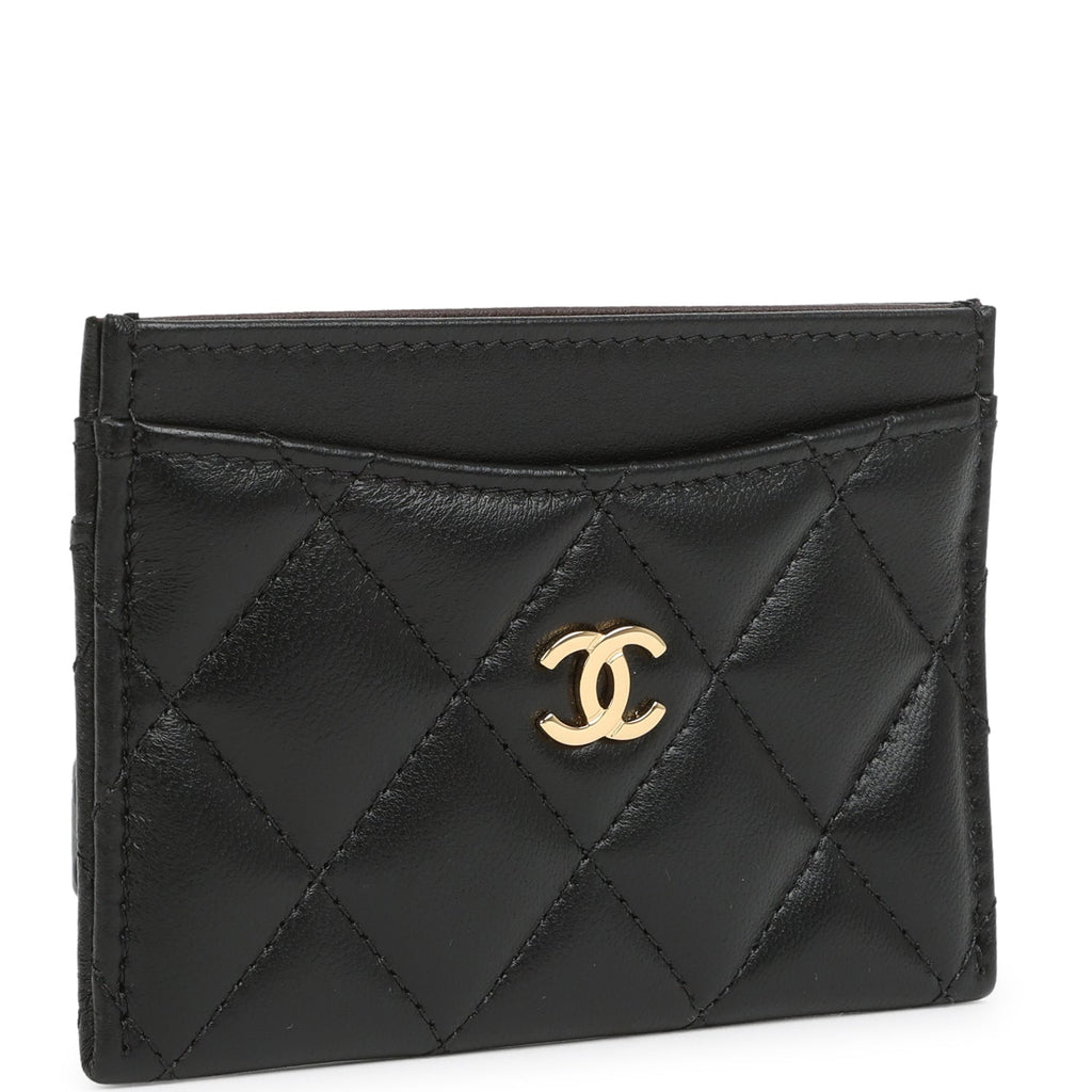 Chanel Classic Card Holder Wallet Black Lambskin Light Gold Hardware Shop for an authentic Chanel classic cardholder in black lambskin leather with light gold hardware in new and never worn condition at Madison Avenue Couture.