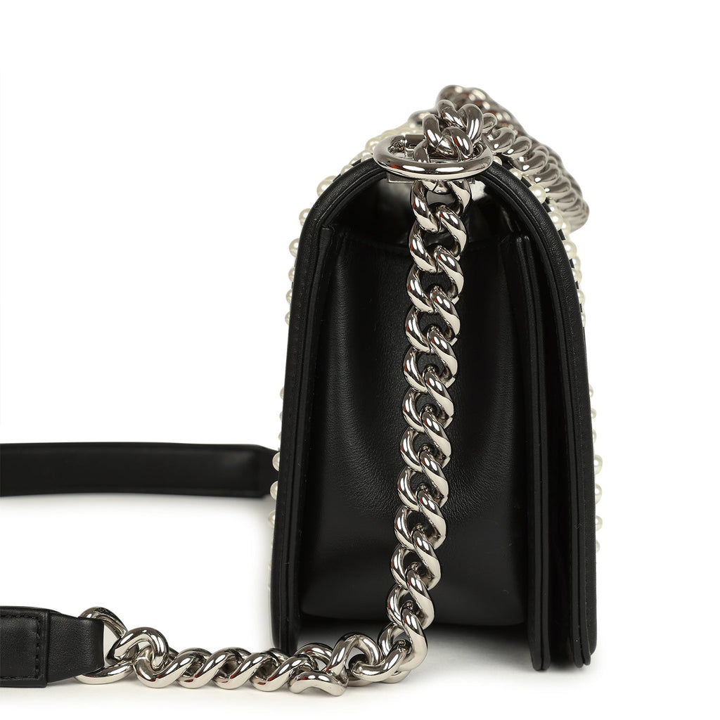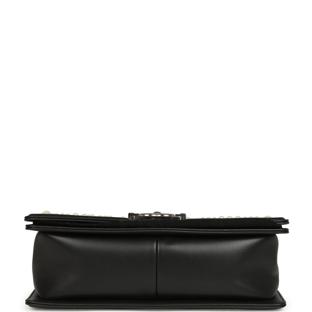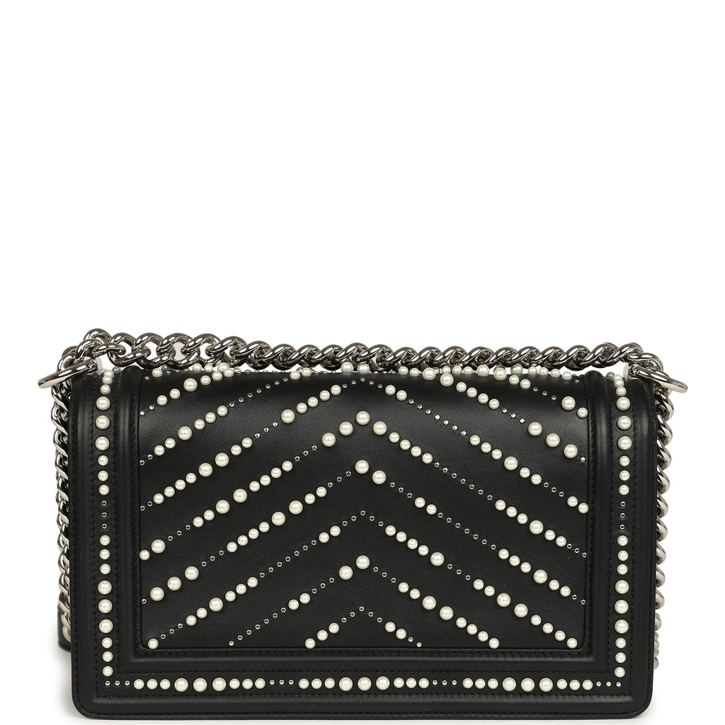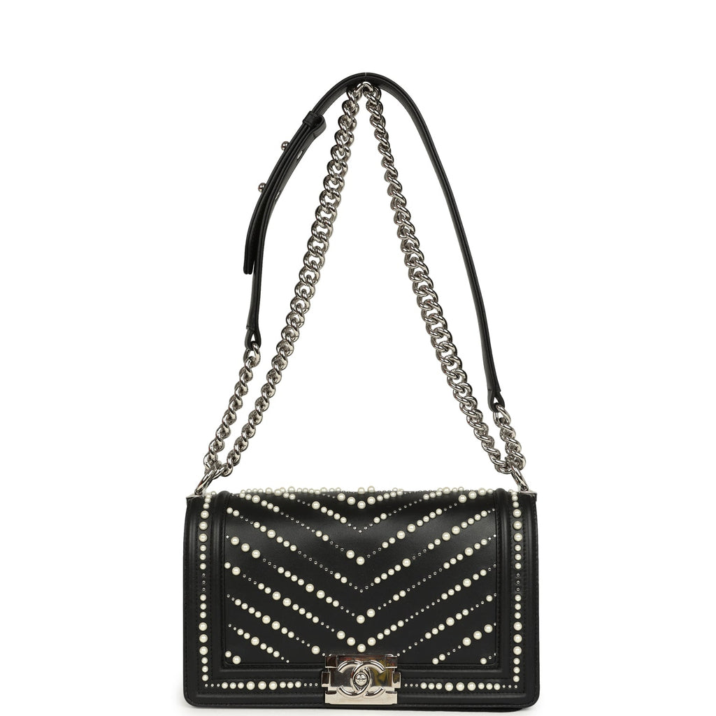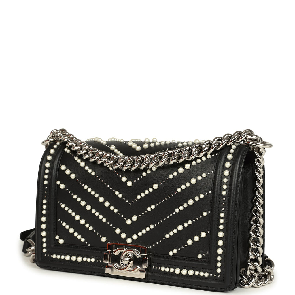 Chanel Medium Boy Bag Black Pearl Chevron Calfskin Silver Hardware Shop for an authentic Chanel Medium Boy Bag with Pearls in black chevron calfskin leather and silver hardware in never worn condition at Madison Avenue Couture.