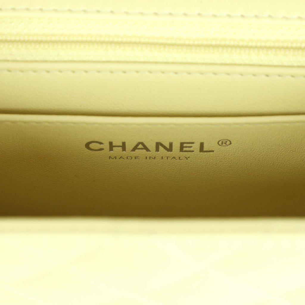 Chanel Mini Square Flap Bag Lime Lambskin Silver Hardware Shop for an authentic Chanel Mini Square Flap in Yellow lambskin leather with silver tone hardware in new and never worn condition at Madison Avenue Couture.