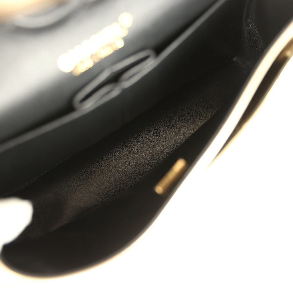 This Chanel Small Classic Double Flap bag is in gold metallic hammered calfskin leather with brushed gold tone hardware and features a front flap with signature CC turnlock closure, half moon back pocket, and adjustable interwoven brushed gold tone chain link and gold leather shoulder/crossbody strap.The interior is lined in black leather with the “love letter” zipper compartment underneath the first flap, an “outer” slit pocket under the second flap, and an interior compartment with two open pockets separated by a “lipstick” compartment.Collection: 21K (RFID)Origin: FranceCondition: New and never wornAccompanied by: Chanel box, Chanel dustbag, RFID chip, carebookMeasurements: 9” width x 5.25″ height x 2.5″ depth; 16.5″ strap drop (9.5″ doubled)