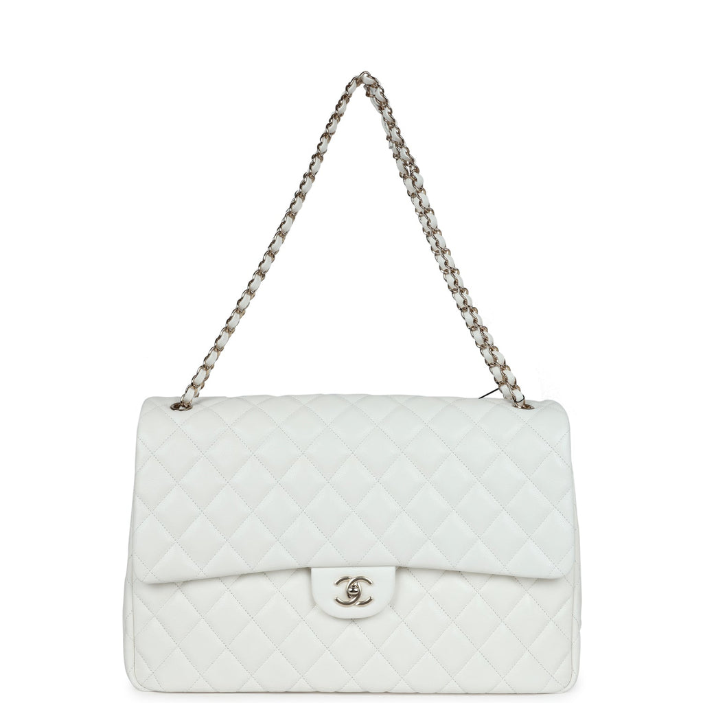 Chanel XXL Classic Single Flap Bag White Shiny Caviar Light Gold Hardware Shop for an authentic Chanel XXL Flap Bag in White shiny caviar leather with light gold tone hardware in new or never worn condition at Madison Avenue Couture
