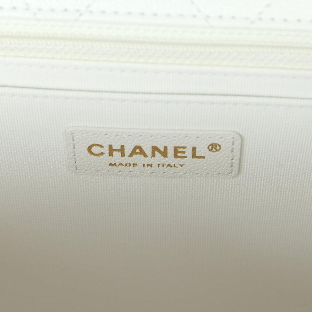 This XXL flap bag is in white shiny caviar with light gold tone hardware and has a front flap with signature CC turnlock closure, rear slip pocket and interwoven white leather and light gold tone chain link shoulder straps.The interior is lined in white canvas and features a zipper pocket with Chanel pull and an open pocket below.Collection: 24COrigin: ItalyCondition: New and never wornAccompanied by: Chanel box, Chanel dustbag, carebook, felt and retail UPCMeasurements: 16″ width x 10″ depth x 4.5″ height; 20″ strap drop (11.5″ doubled)