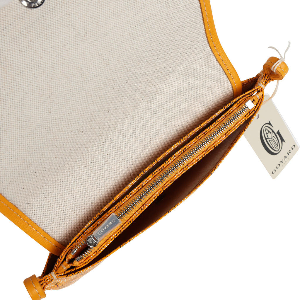 This Goyard Plumet Pocket Wallet is in yellow Goyardine Canvas and yellow Chevroches calfskin leather with palladium hardware, contrast stitching, exterior slip pocket, and a detachable crossbody strap.The interior is lined in white linen and cotton with two main compartments, a center zip pocket divide, and two small slip pockets.Origin: FranceCondition: New and never wornAccompanied by: Goyard dustbag, retail UPC, strap, strap dustbag, carebookMeasurements: 8” x 5.5″ x 1″