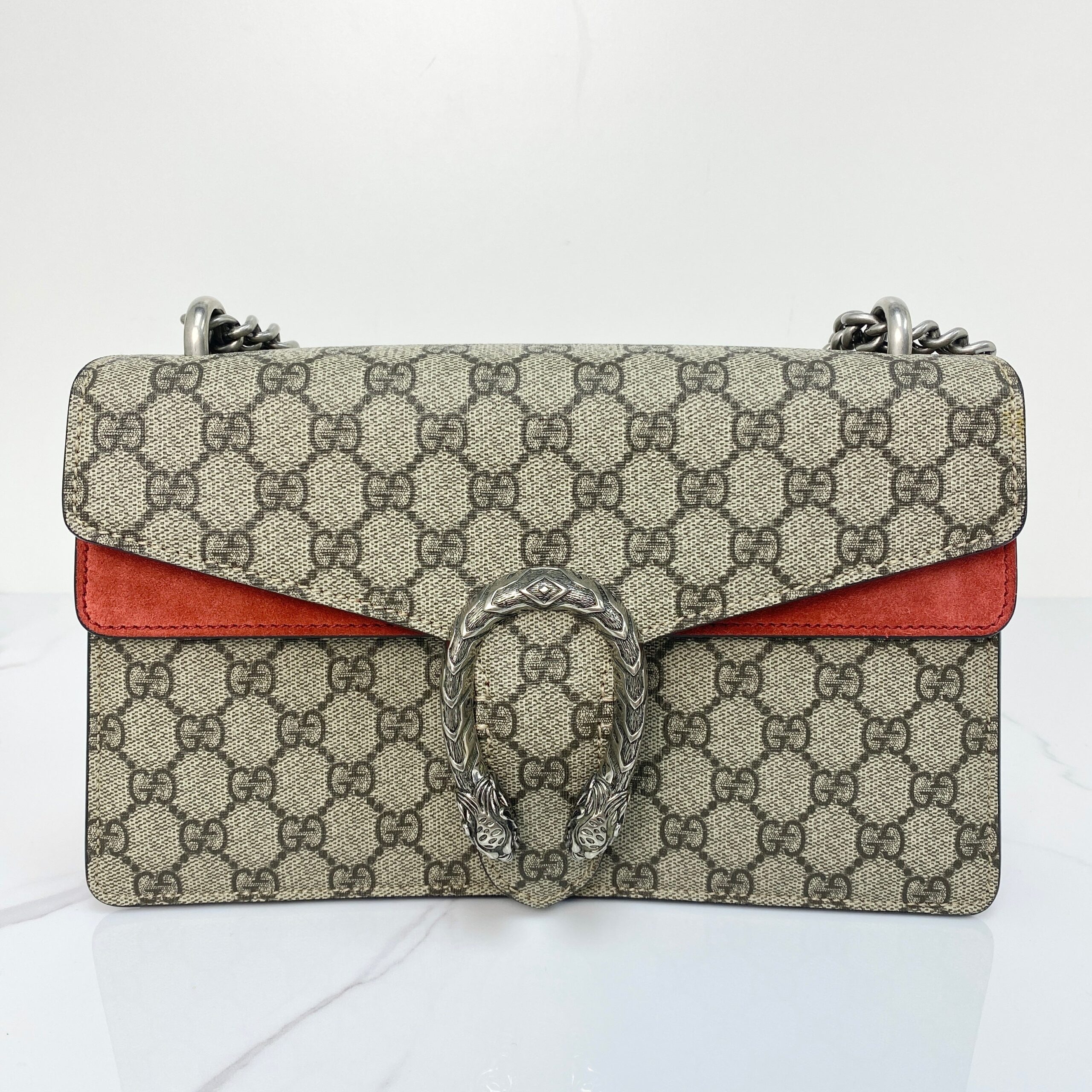 Bold yet timeless—the Gucci Dionysus Shoulder Bag in monogram canvas with red suede accents brings standout style to any look. Dress it up with tailoring or down with denim—this bag does it all.