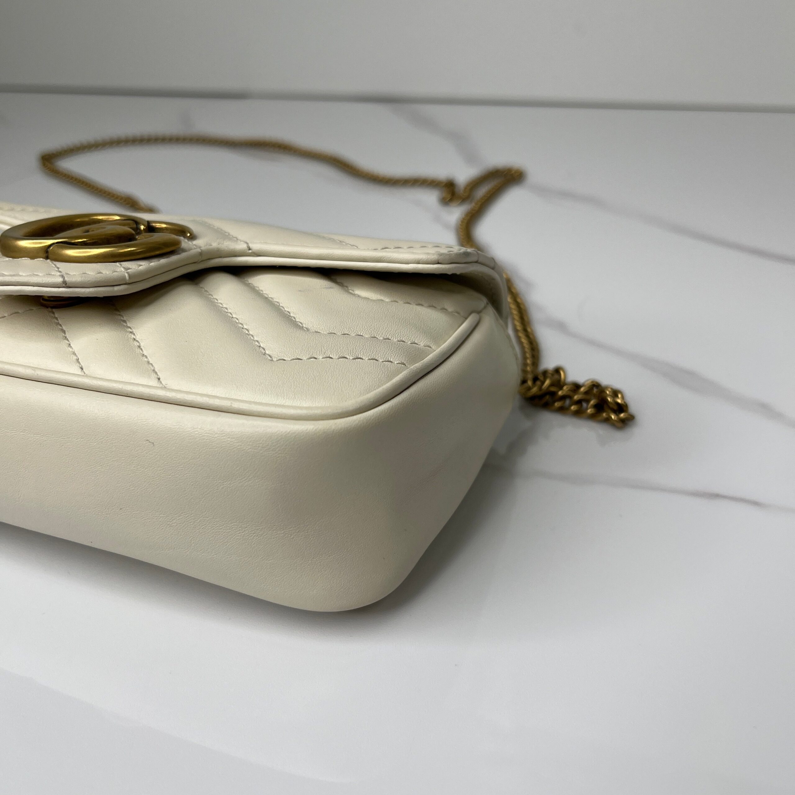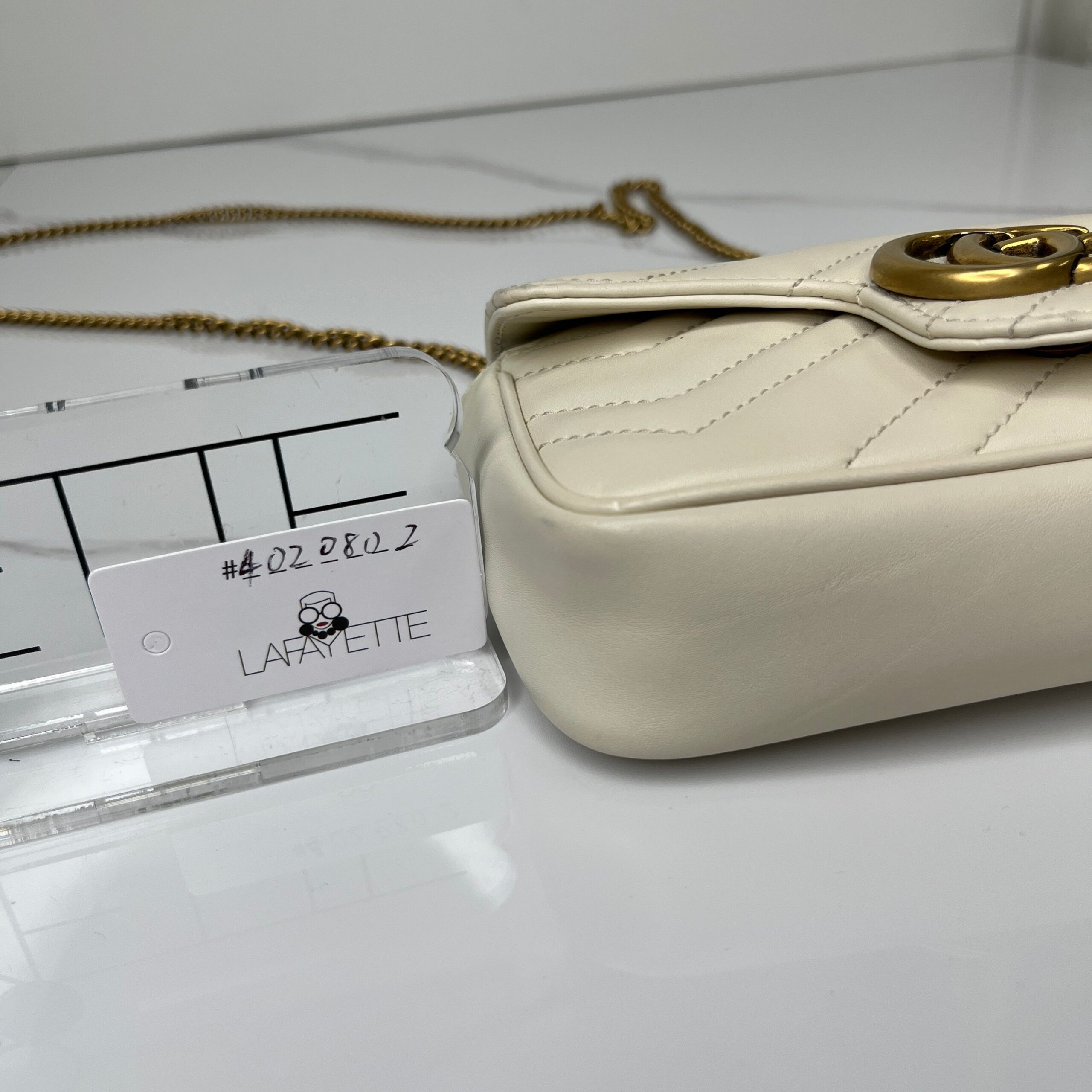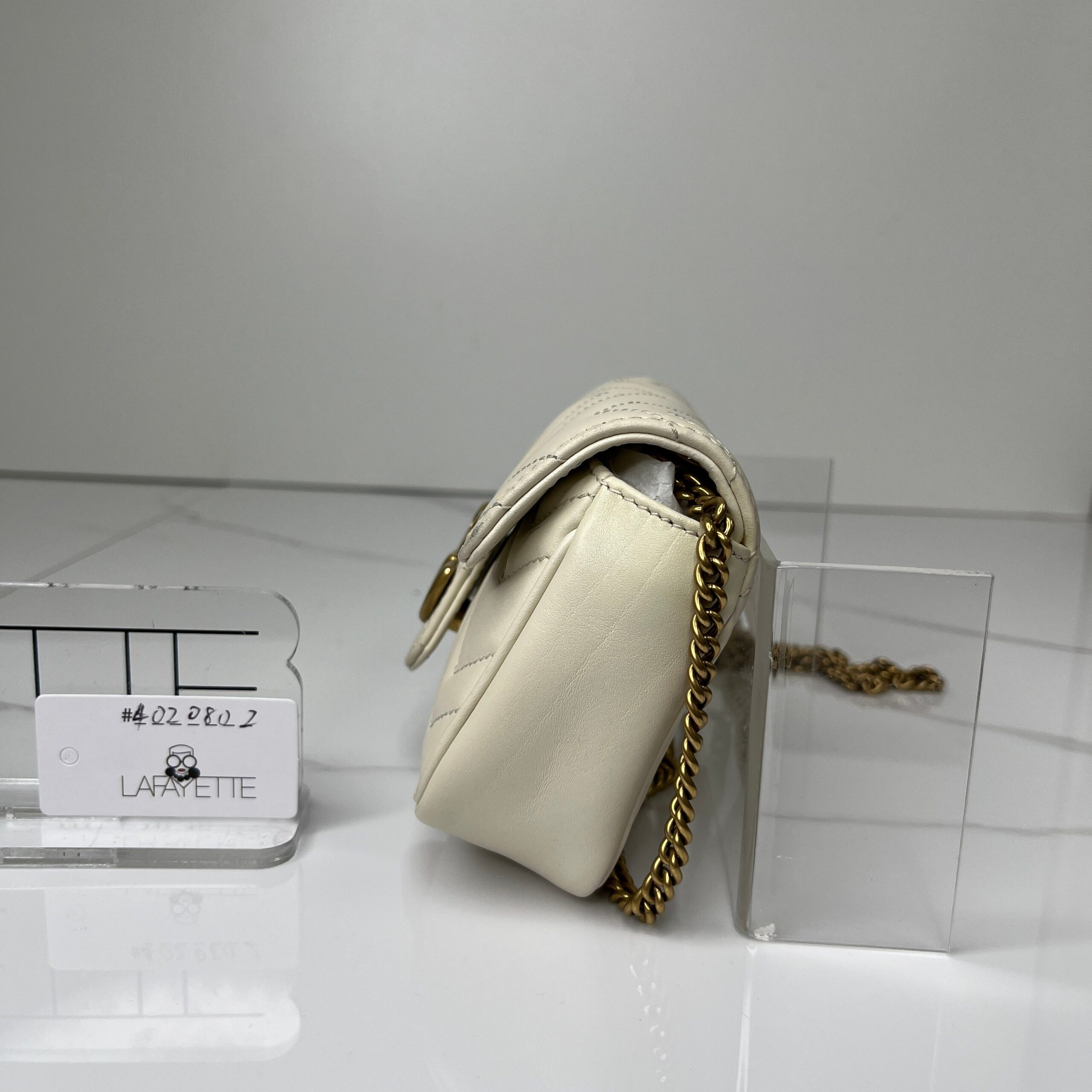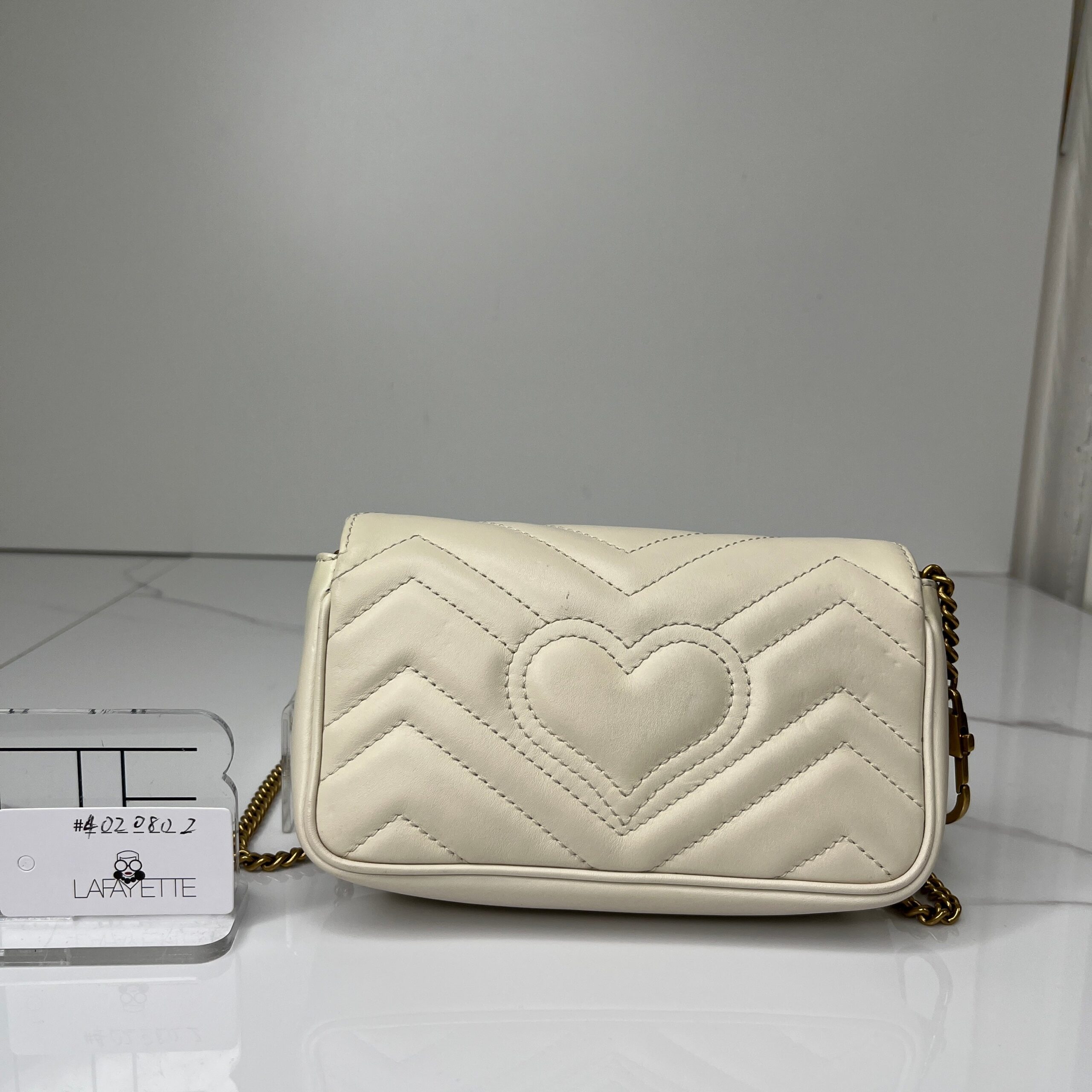 Sling this chic white Gucci Marmont Super Mini over your shoulder for your next night out. Its compact design packs a punch, fitting all your essentials with ease, while its classic style adds a touch of timeless elegance to any outfit.