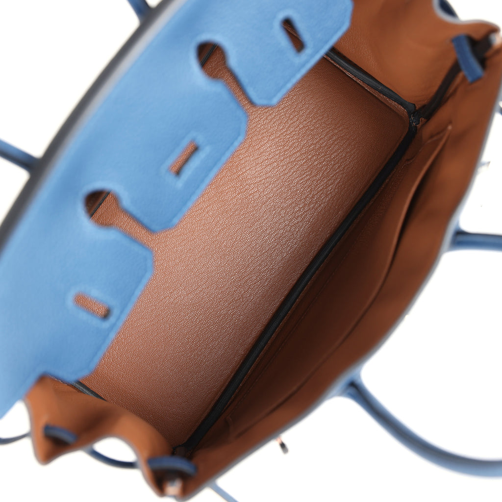 Hermes Birkin 25 Deep Bleu Verso Togo Palladium Hardware Shop for an authentic Hermes Birkin 25 in Deep Bleu and Muscade togo leather with palladium hardware in new and never worn condition at Madison Avenue Couture.