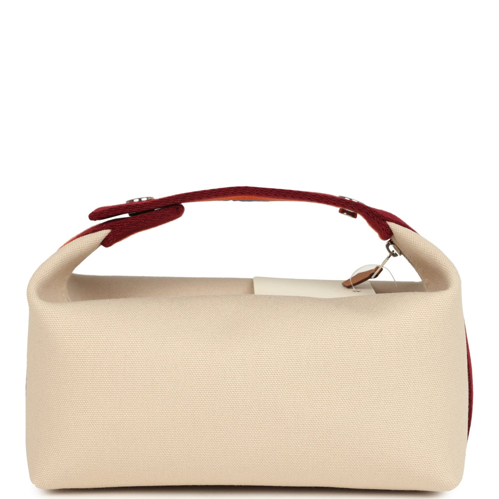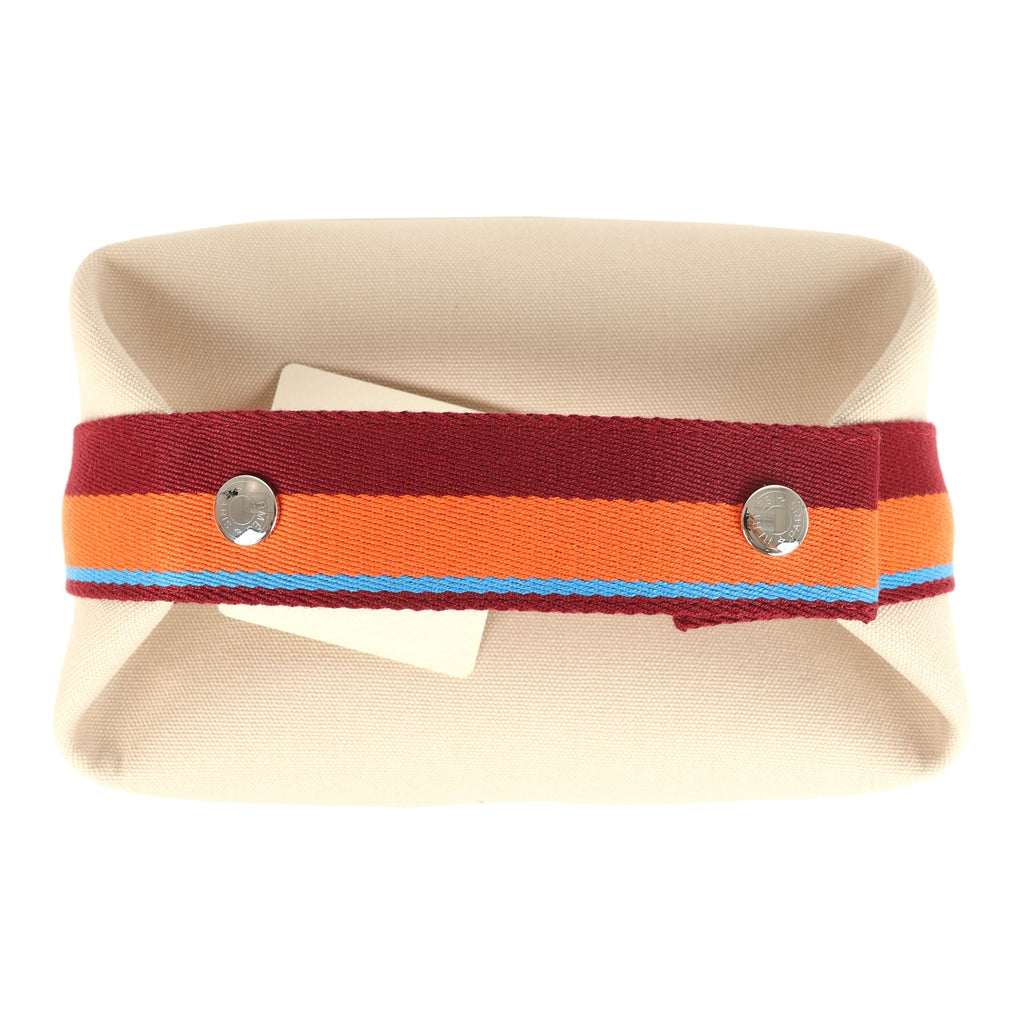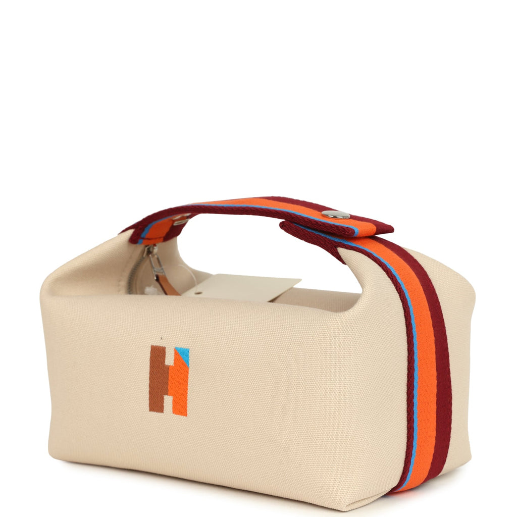 This Hermes Bride A Brac Case Pavillon PM Naturel canvas with palladium hardware, features large pouch, anti-stain waterproof lining, a multicolored Embroidered “H” on the front, tonal stitching, zippered closure, and a snap closure multicolored canvas top handle.The interior is lined in Beige classic herringbone lining and has three interior pockets.Origin: FranceCondition: New and never wornMeasurements: 8.25″ width x 6″ height x 4.5″ depth; 2.5″ handle