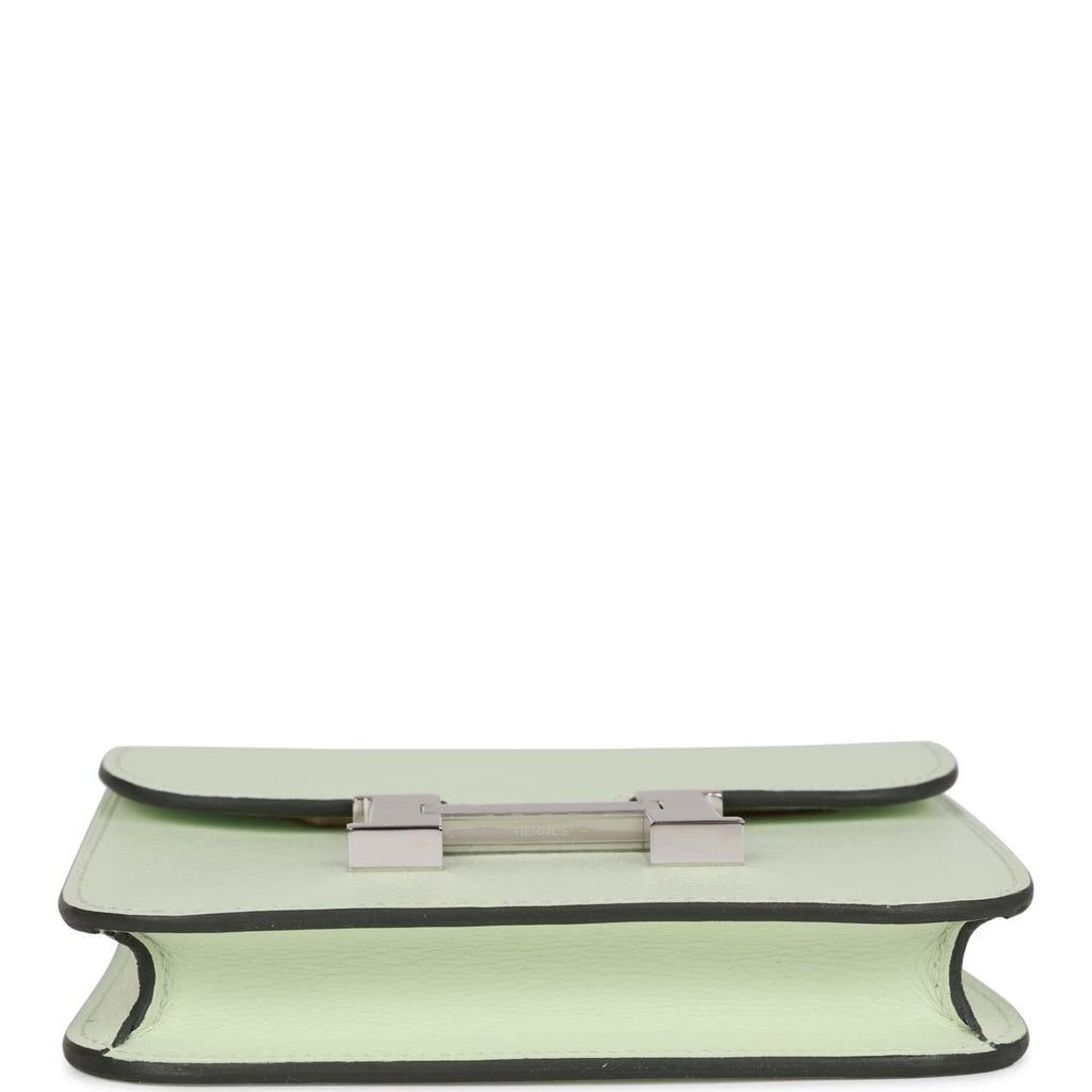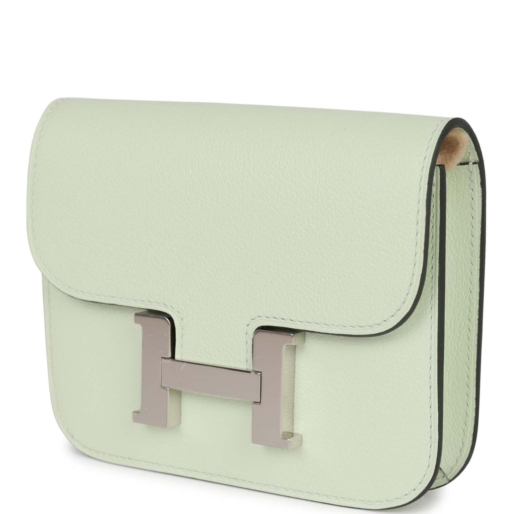 Hermes Constance Slim Wallet Vert Fizz Evercolor Palladium Hardware Shop for an authentic Hermes Constance Slim Wallet in Vert Fizz evercolor leather, in new or never worn condition with plastic on hardware at Madison Avenue Couture.