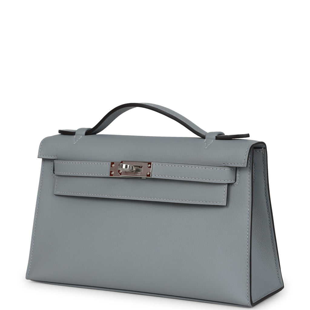 Hermes Kelly Pochette Gris Pantin Swift Palladium Hardware Shop for an authentic Hermes Kelly Pochette in Gris Pantin Swift leather with palladium hardware in new and never worn condition at Madison Avenue Couture.