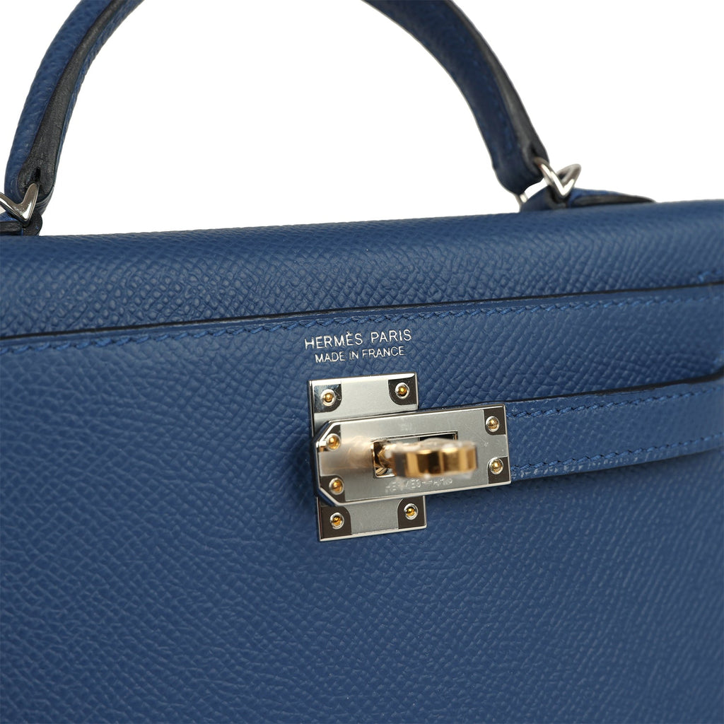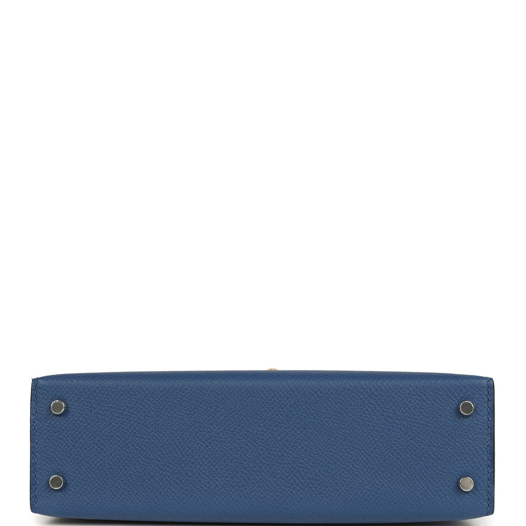 This Kelly, in the Sellier style, is in Bleu Tie epsom leather with Electrum silver and gold hardware and has tonal stitching, two straps with front toggle closure, single rolled handle and removable shoulder strap.The interior is lined with Bleu Tie lambskin leather and has one open pocket on the back wall.Collection: K (2025)Origin: FranceCondition: New and never worn (plastic on hardware)Accompanied by: Hermes box, Hermes dustbag, felt, removable strap, removable strap dustbag, carebookMeasurements: 7.5″ width x 4.5″ height x 2.2″ depth; 2.5″ handle drop (18″ shoulder strap drop)