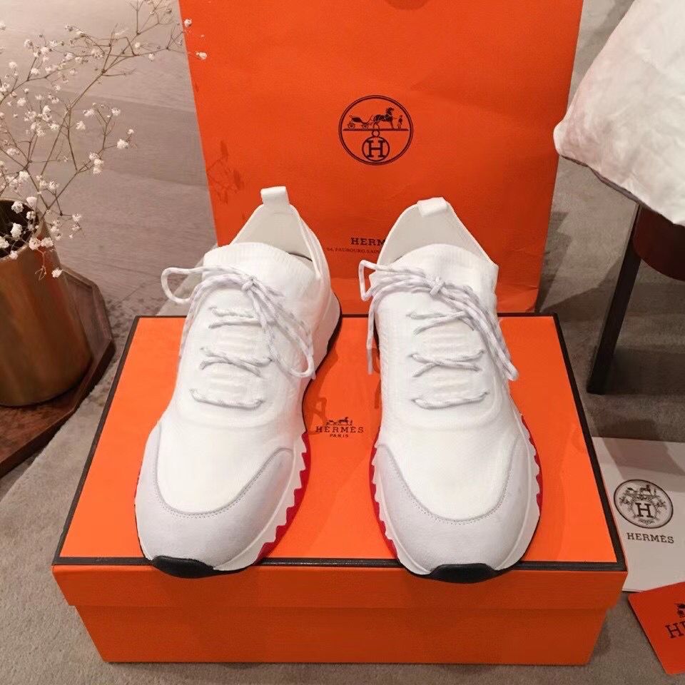 A reinterpretation of a classic style, The Hermes Addict Sneaker in bicolor knit with optical illusion, these pairs feature orange zigzag rubber insert and grey leather insert on the back, white rubber midsole and black rubber insole.