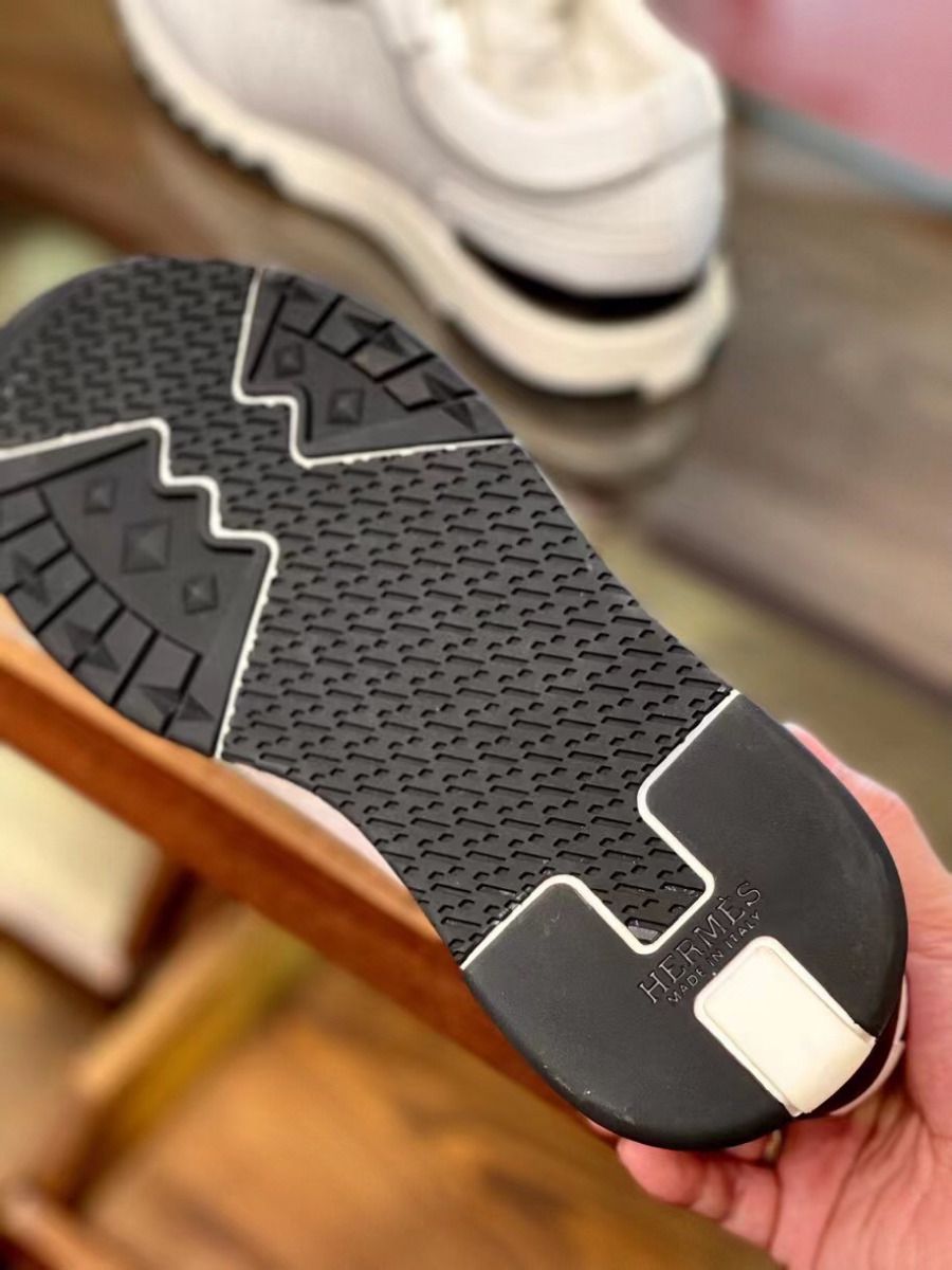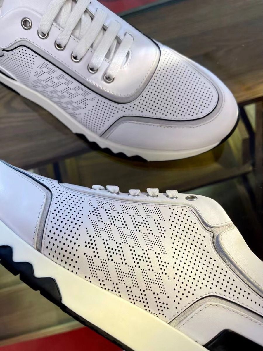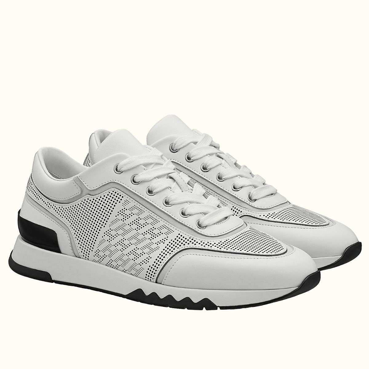 Hermes C-Addict Sneaker in perforated calfskin with “H en Biais” motif. For an elegant and modern look, this pair features black zigzag rubber insert on the front and black rubber insert on the back.
