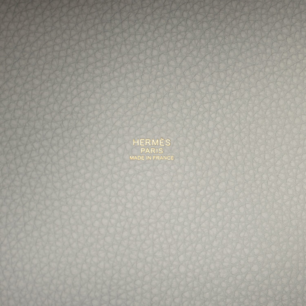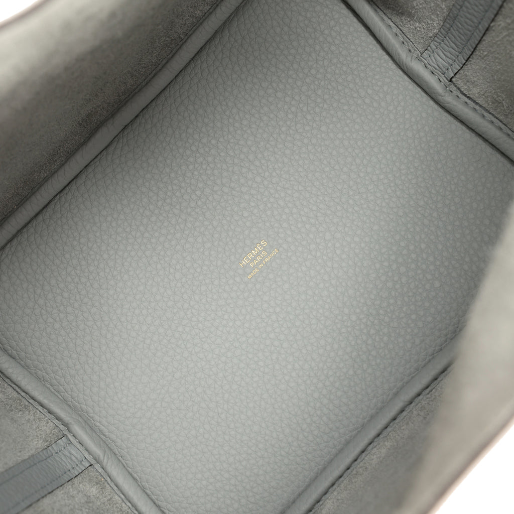 This Picotin is in Bleu Glacier clemence leather with gold hardware and has tonal stitching with two top handles.The interior is lined with Bleu Glacier suede natural leather, no interior pockets and has a pull through closure secured by padlock.Collection: W (2024) Origin: FranceCondition: New and never worn (plastic on hardware)Accompanied by: Hermes box, Hermes dustbag, lock, keys, lock and key dustbag, carebook, ribbonMeasurements: 8.5” width x 8” height x 6.5” depth; 7” handles