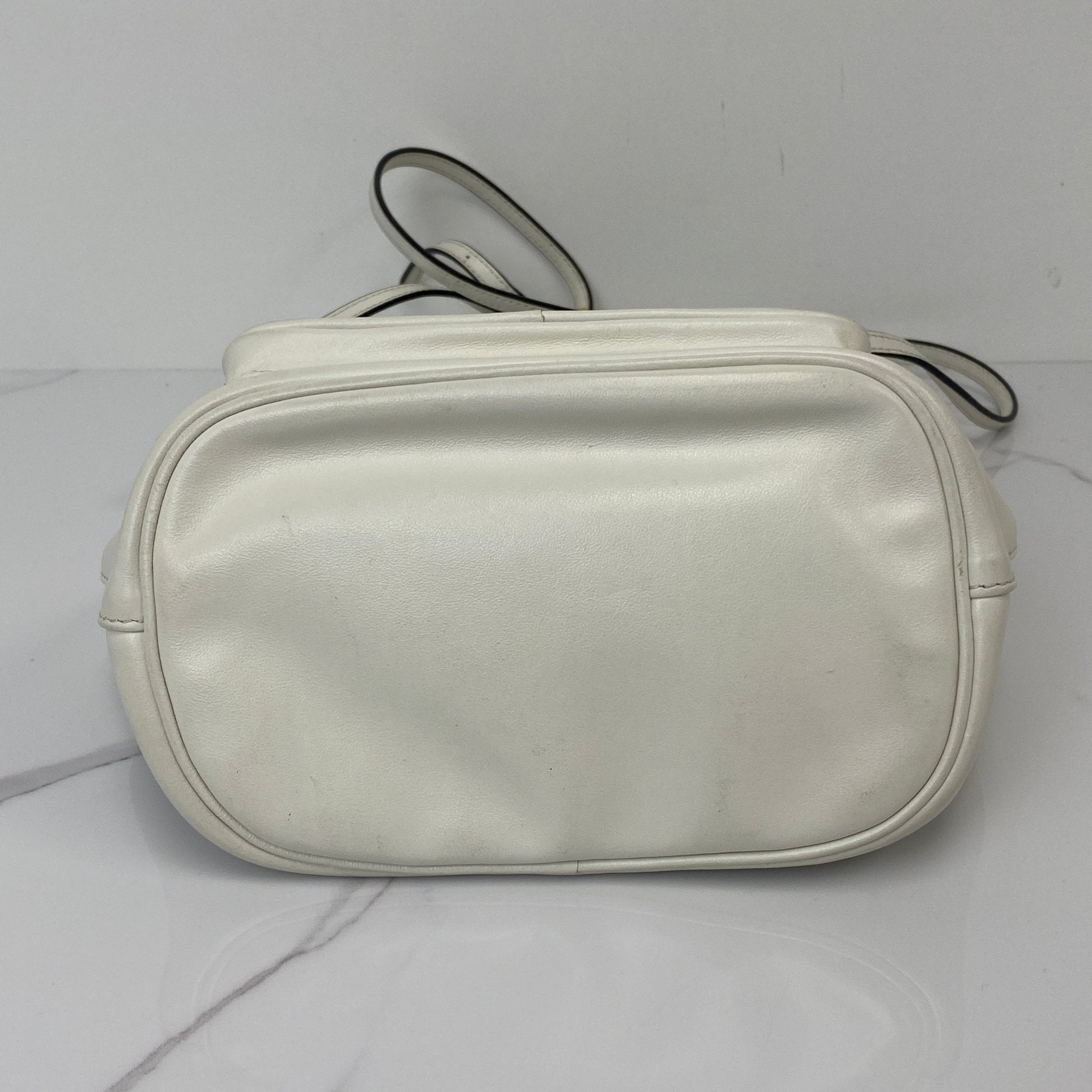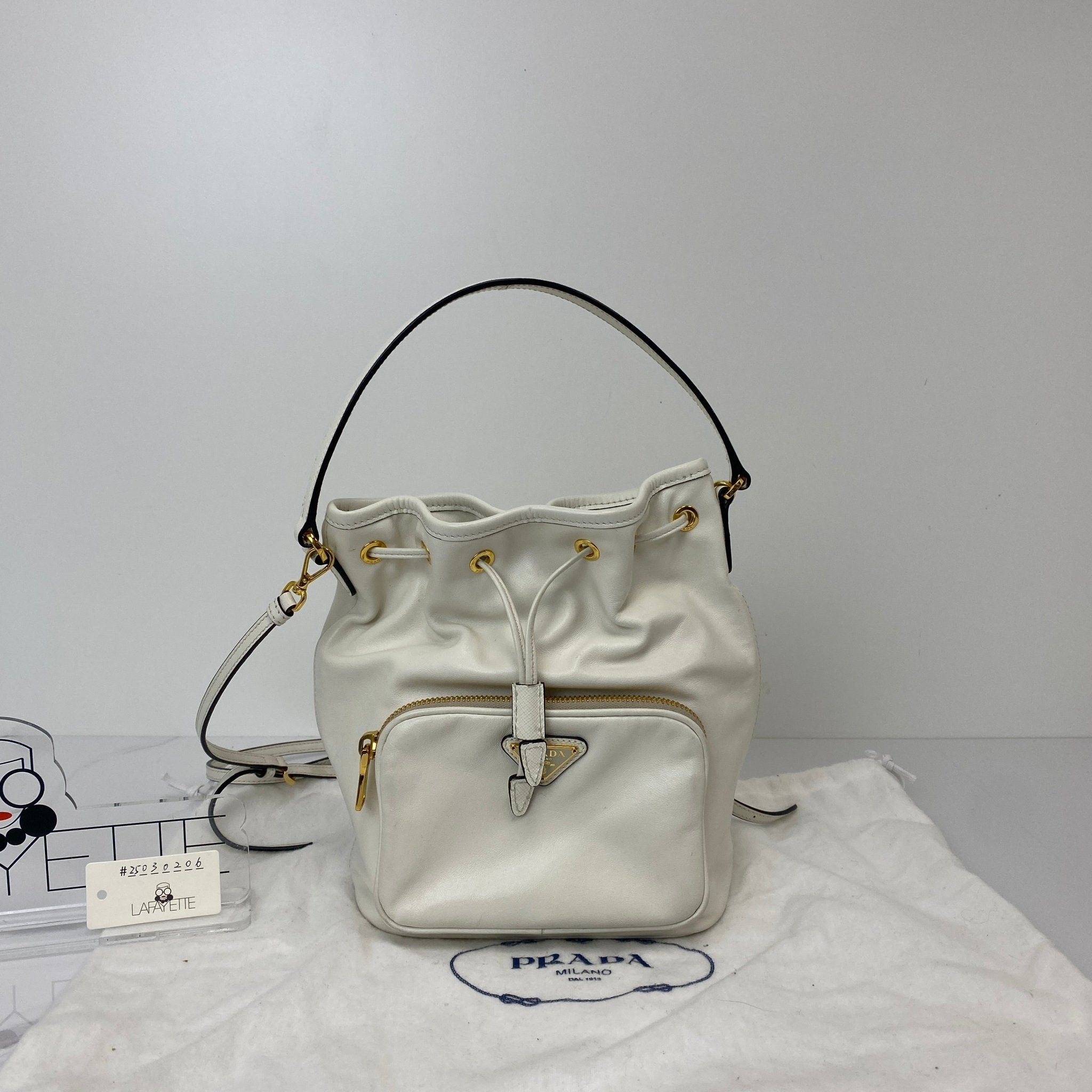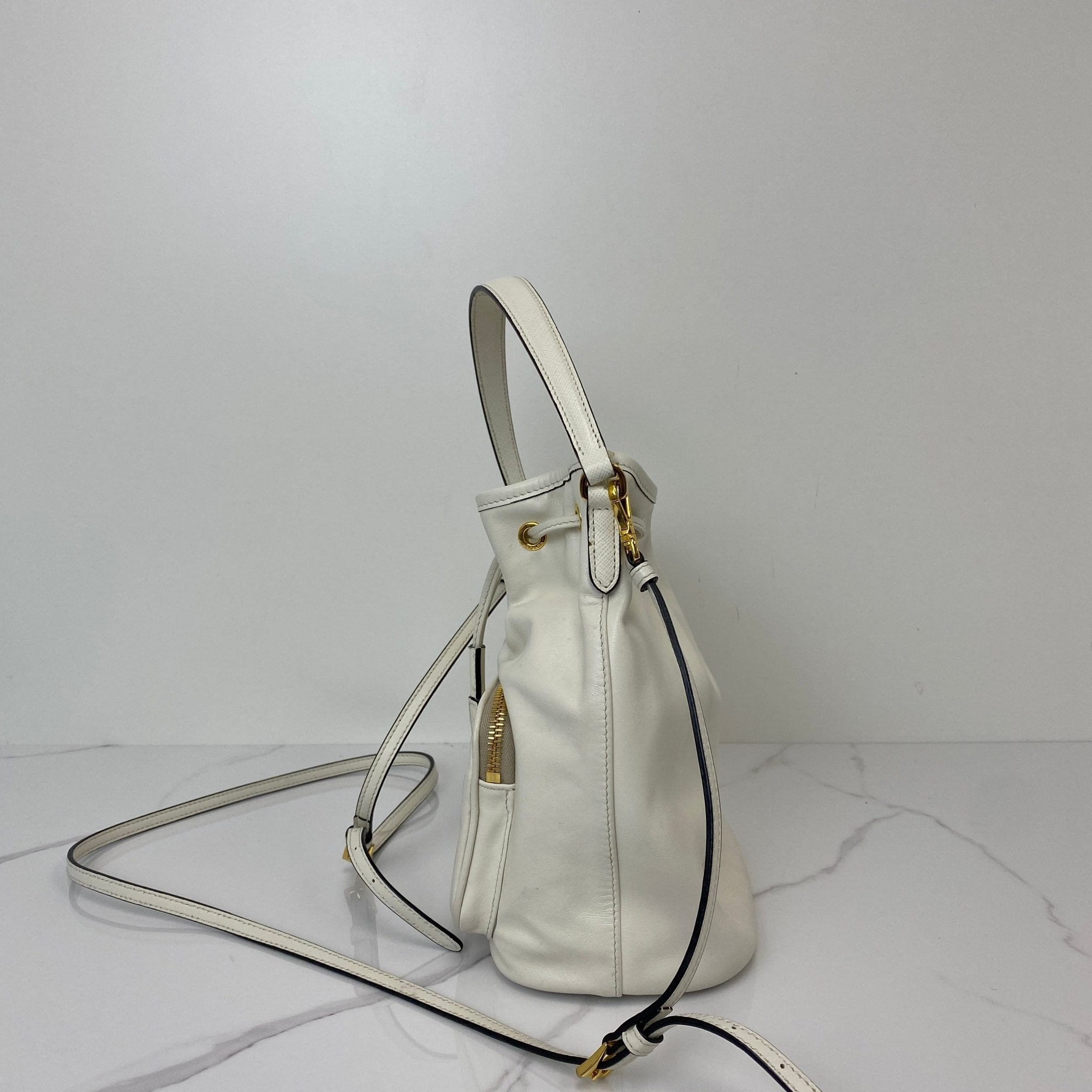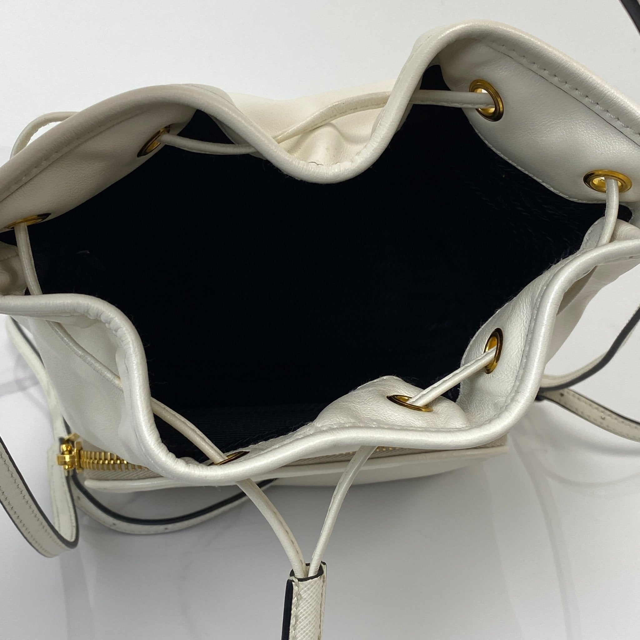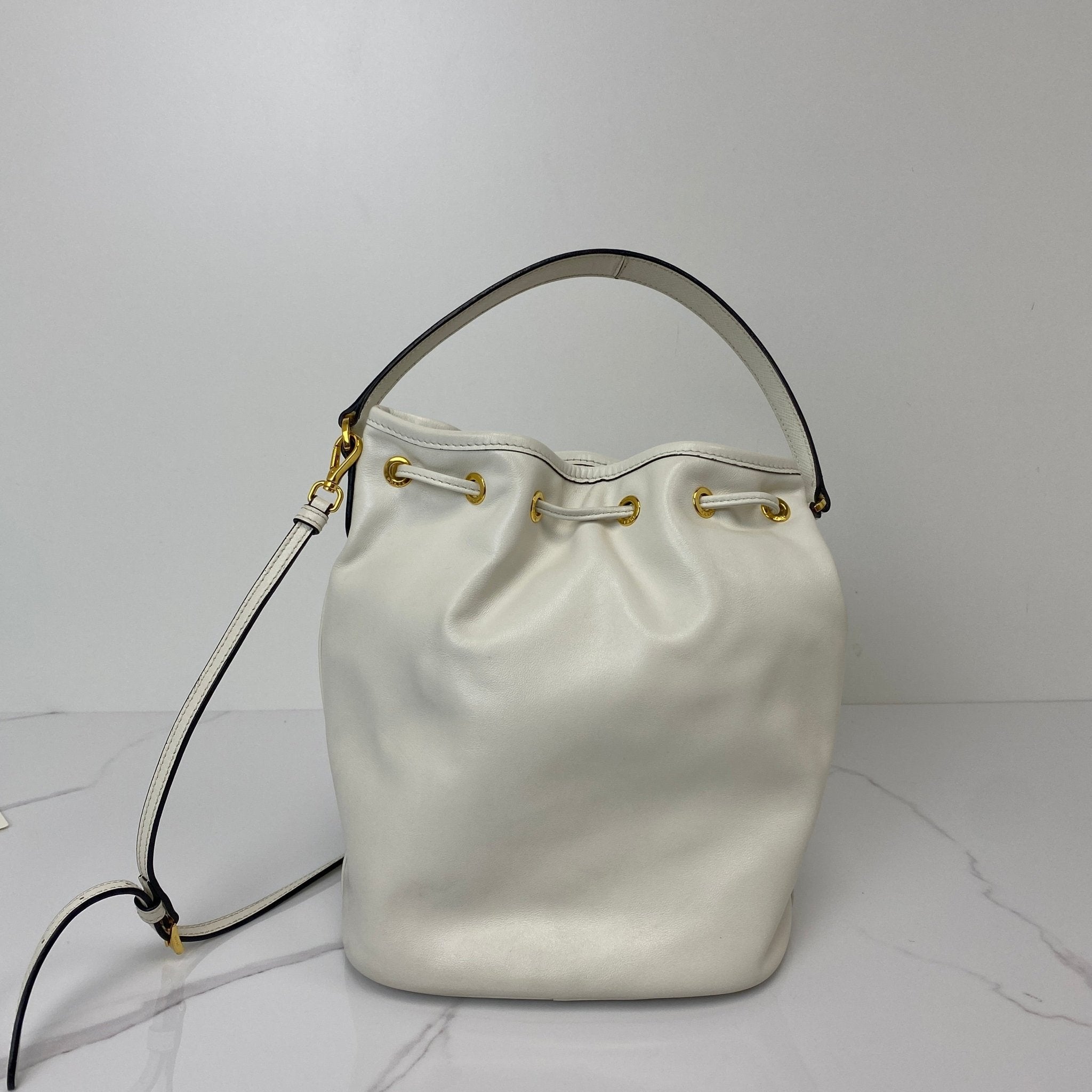 The Prada Duet Re-Nylon Bucket Bag in White calfskin is the perfect blend of sporty and chic. Its minimalist design and versatile silhouette make it ideal for casual days or elevated evening looks—carry it by hand or wear it crossbody for effortless style.