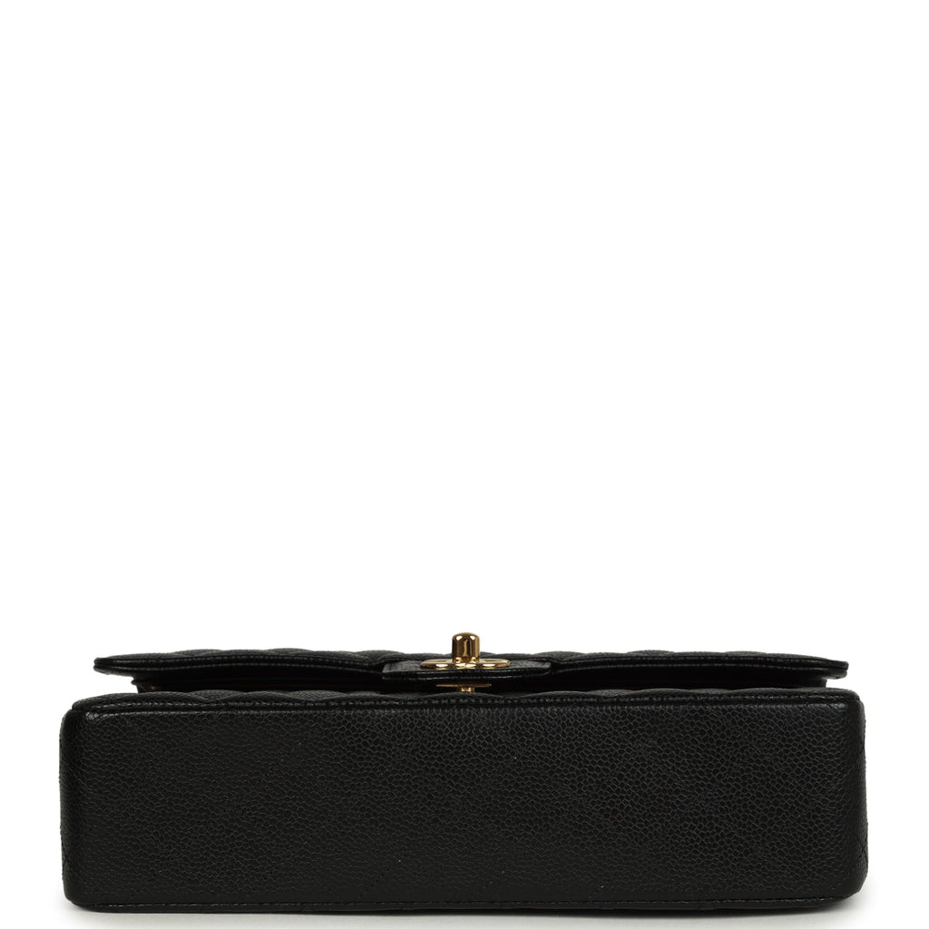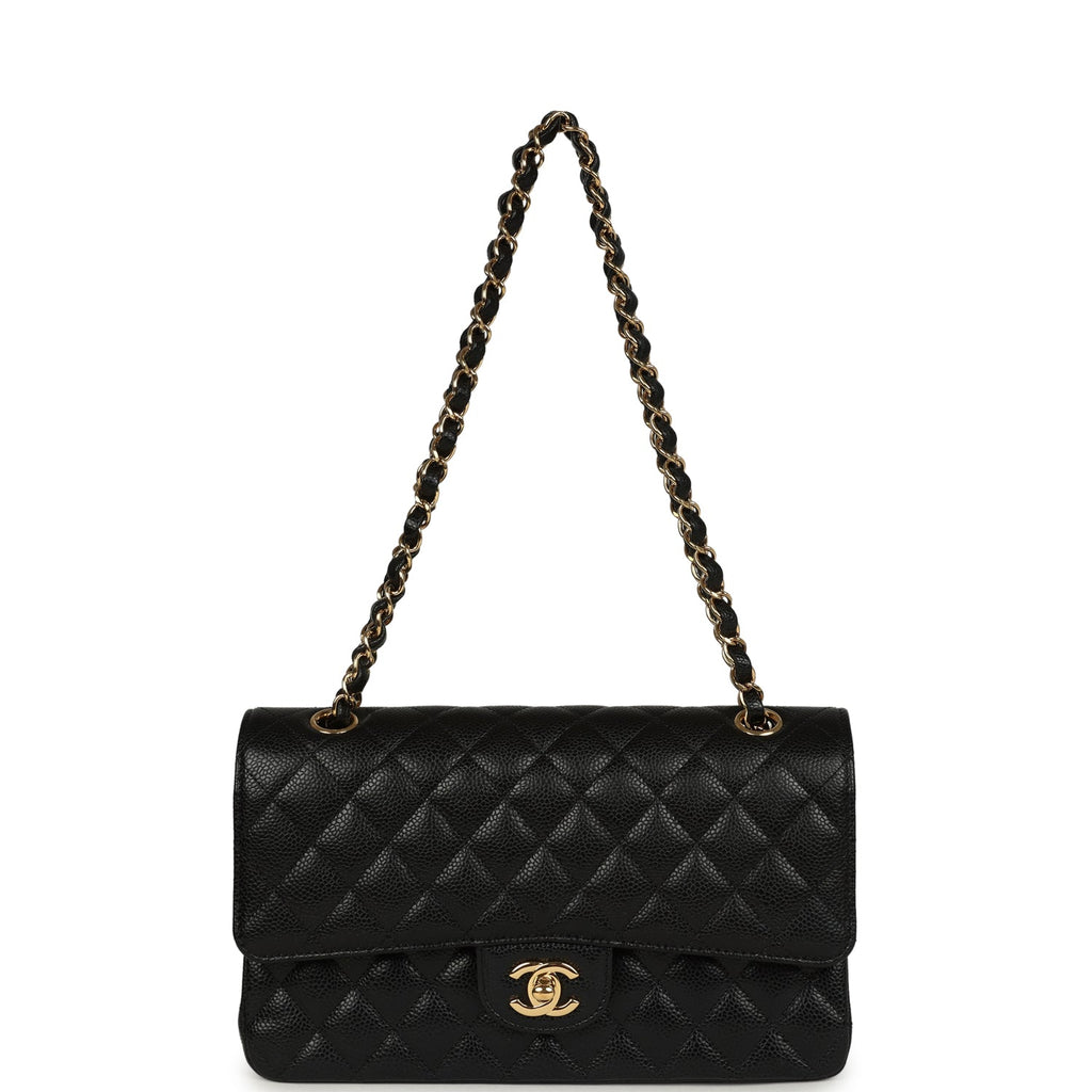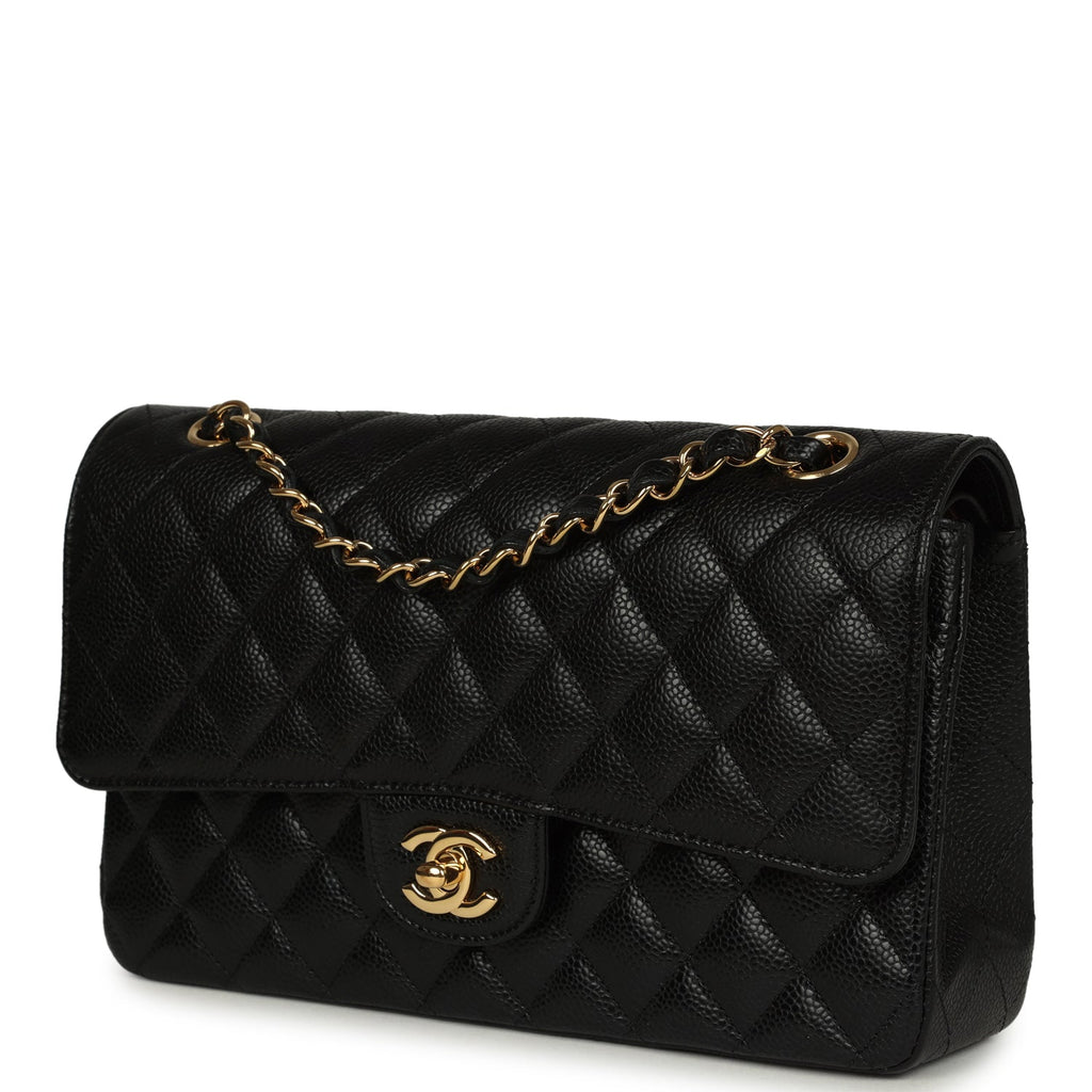 Pre-owned Chanel Medium Classic Double Flap Black Caviar Gold Hardware Shop an authentic pre-owned Chanel medium classic double flap bag in black caviar leather with gold tone hardware in mint condition at Madison Avenue Couture.