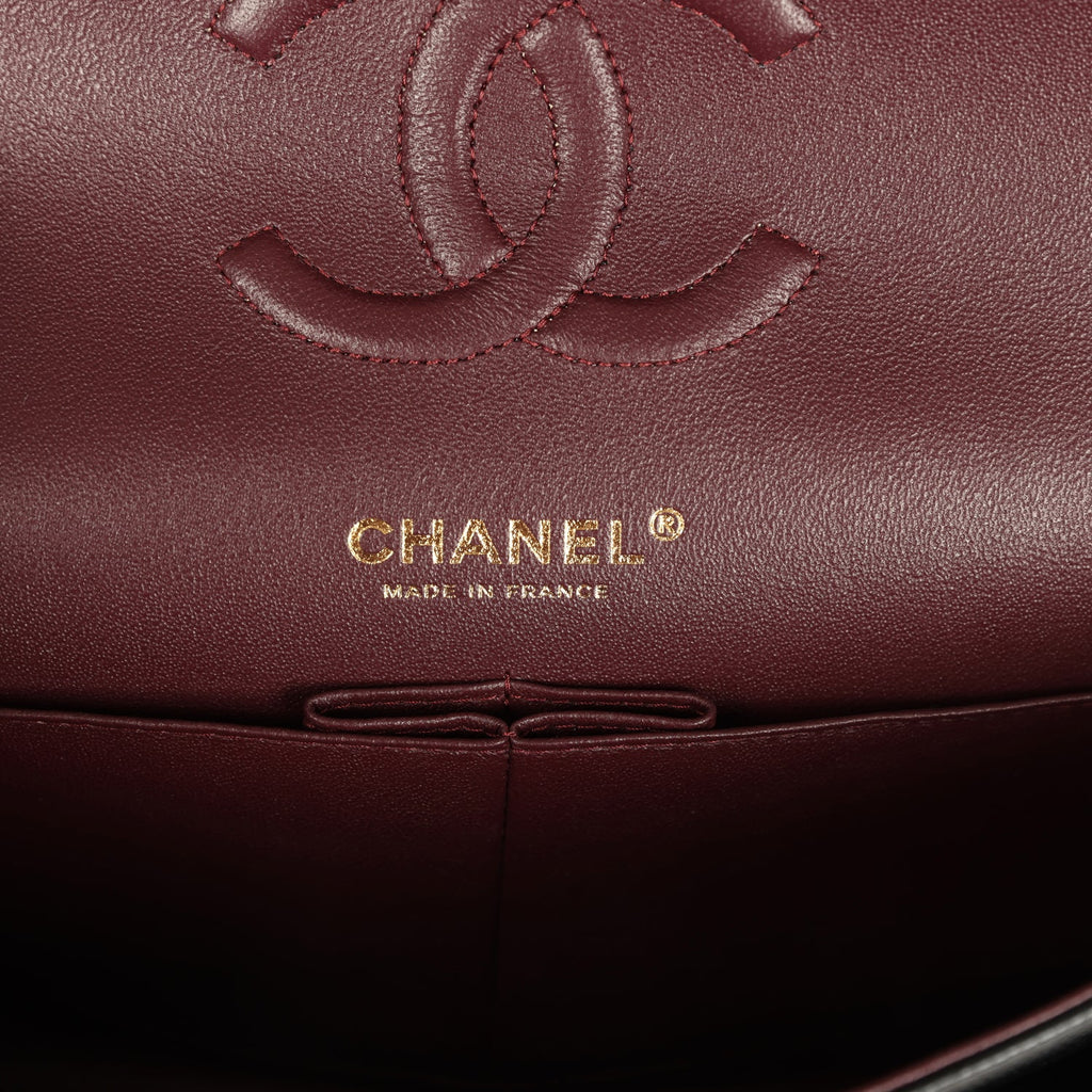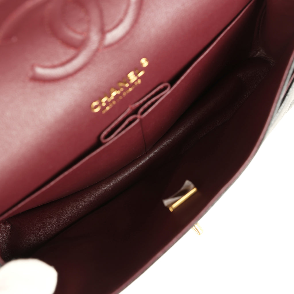 This Medium Classic Double Flap Bag is in black caviar leather with gold hardware, front flap with CC turnlock closure, tonal stitching, half moon back pocket and an adjustable interwoven gold chain link and Black leather shoulder/crossbody strap.The interior is lined in burgundy leather with the “love letter” zipper compartment underneath the first flap, an “outer” slit pocket under the second flap, and an interior compartment with two open pockets separated by a “lipstick” compartment.Collection: REV (RFID)Origin: FranceCondition: Pre-owned; Mint – This bag retains its shape structure. The exterior leather is clean with no signs of wear. The front CC turnlock closure hardware has faint hairline scratches. The interior leather is clean overall except some minor creasing.Accompanied by: Chanel box, Chanel dustbag, carebook, felt, RFID chip, retail UPC, ribbonMeasurements: 10″ width x 6″ height x 2.75″ depth; 16.5″ strap drop (9.5″ doubled)
