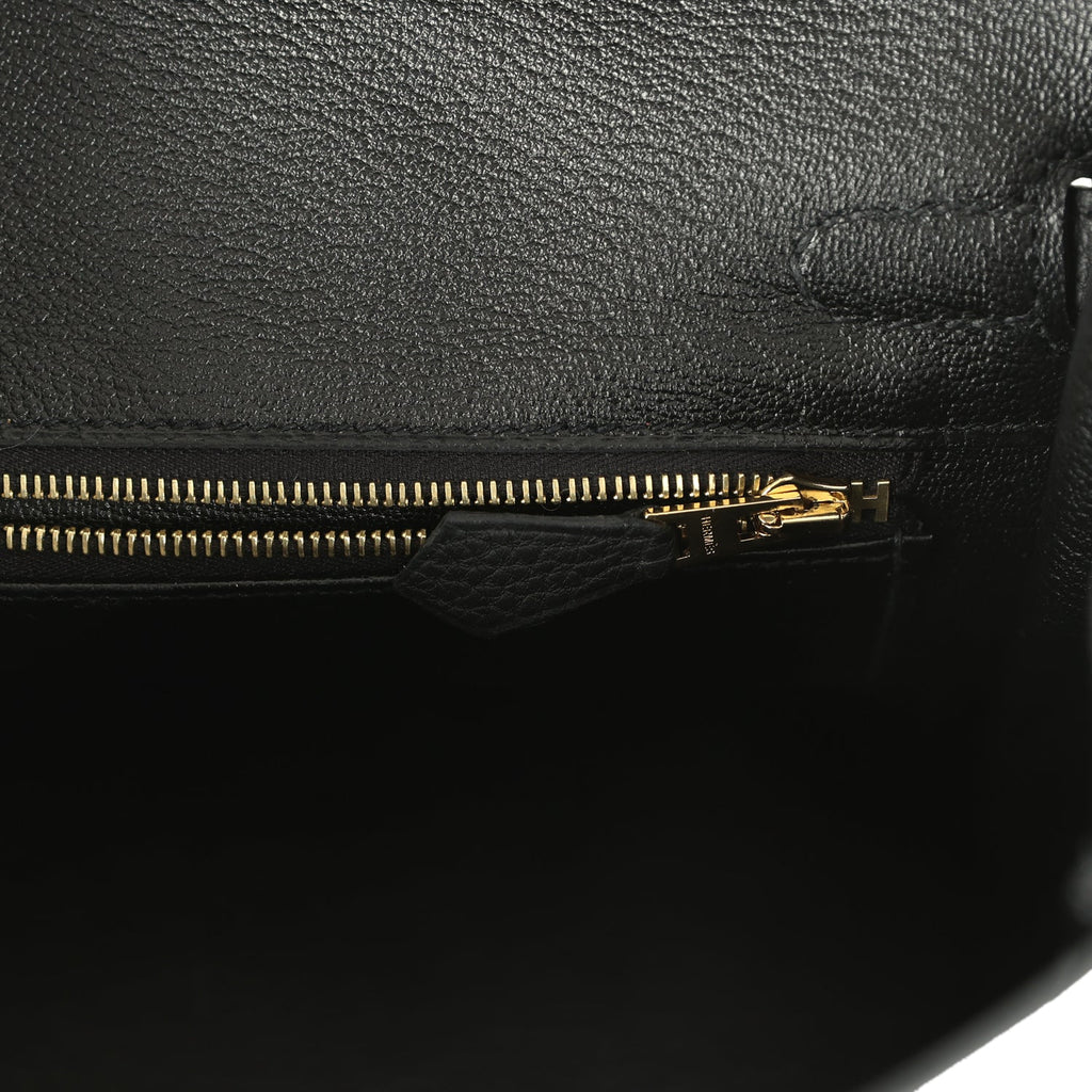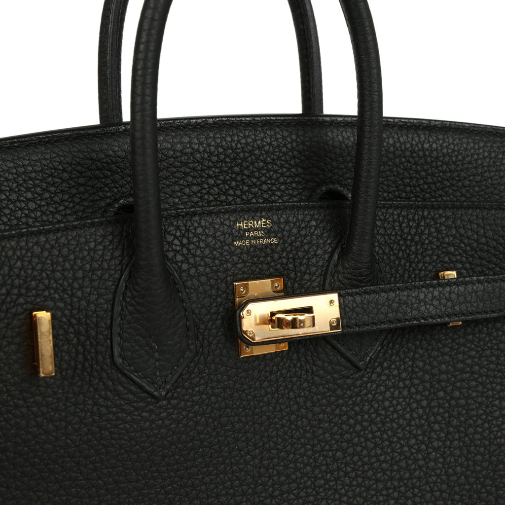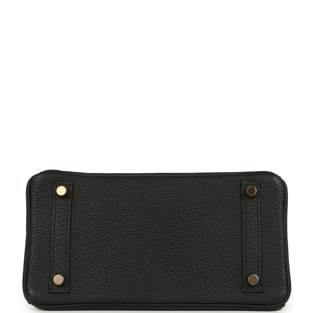 This Birkin is in Black togo leather with rose gold hardware, has tonal stitching, front flap, two straps with center toggle closure, clochette with lock and two keys, and double rolled handles.The interior is lined with Black chevre leather and has a zip pocket with an Hermes engraved zipper pull and an open pocket on the opposite side.Collection: D (2019) Origin: FranceCondition: Pre-owned; Mint – This bag retains its shape structure. There is partial plastic on the hardware. The exposed turnlock and one foot have some light scratching present. The exterior leather is clean with minimal signs of wear. The interior leather has a few faint press marks to the base but is otherwise clean.Accompanied by: Hermes box, Hermes dustbag, felt, clochette, lock, two keys, clochette dustbag, carebook, rainhatMeasurements: 10″ width x 7.5″ height x 4.75″ depth; 2.75″ handle drop