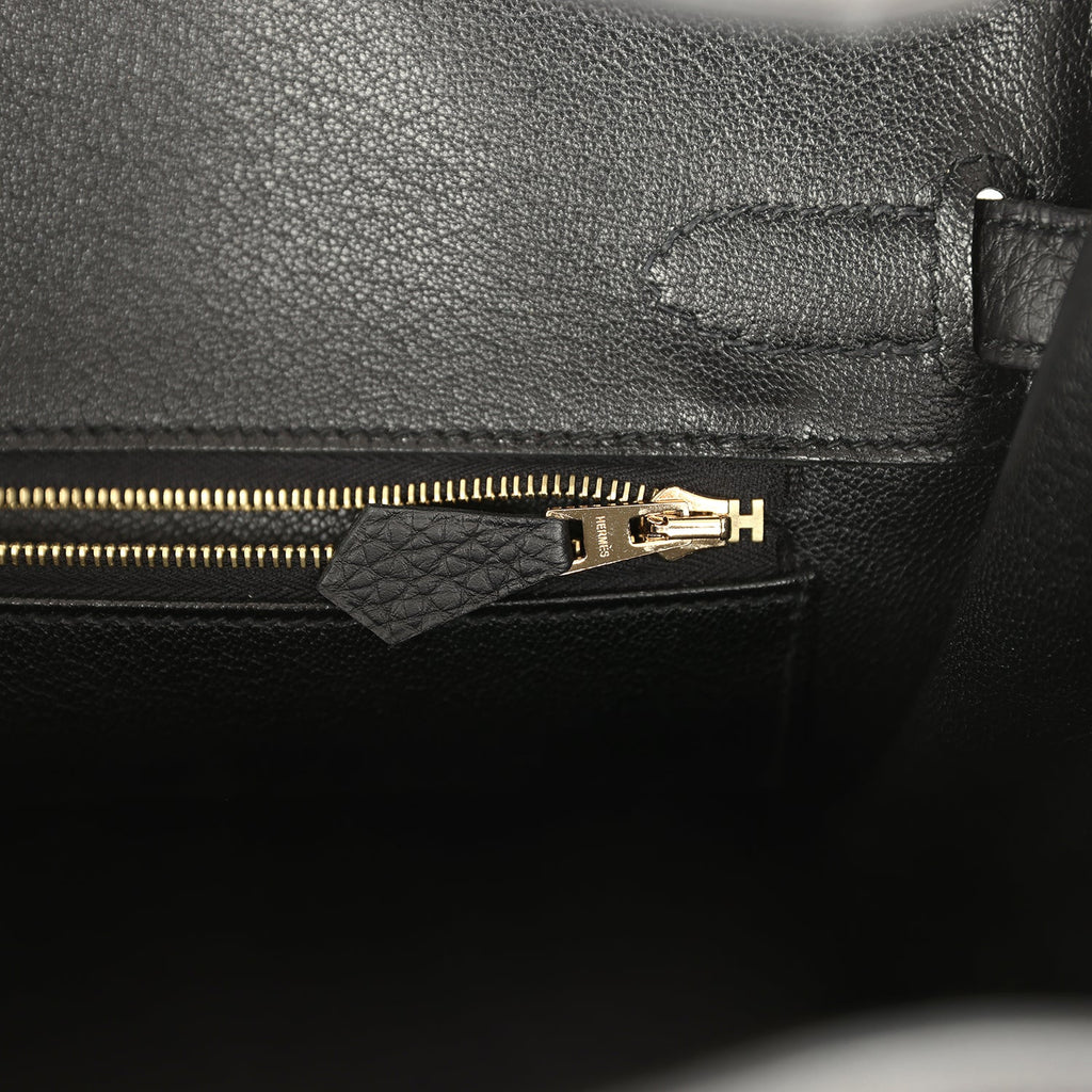 This Birkin is in Black togo leather with gold hardware and features tonal stitching, front flap, two straps with center toggle closure, clochette with lock and two keys, and double rolled handles.The interior is lined with Black chevre leather and has a zip pocket with an Hermes engraved zipper pull and an open pocket on the opposite side.Collection: Z (2021)Origin: FranceCondition: Pre-owned; Excellent – This bag retains its shape structure, however there is some minor waving present to the pull straps. There is no plastic on the hardware, resulting in light to moderate scratching to the hardware. The right pontet is slightly bent inwards. The exterior leather is mostly clean with the exception of some minor rubbing to the corners. The interior leather has some marks to the base and some faint marks to the front wall.Accompanied by: Hermes box (pre-owned), Hermes dustbag, clochette, lock, two keys, rainhatMeasurements: 11.75″ width x 9.5″ height x 8″ depth; 4.25″ handle drop