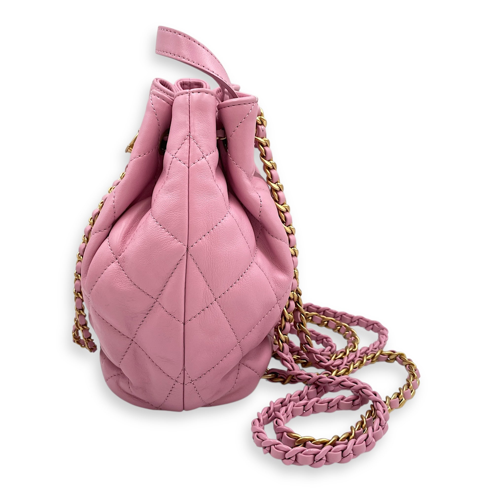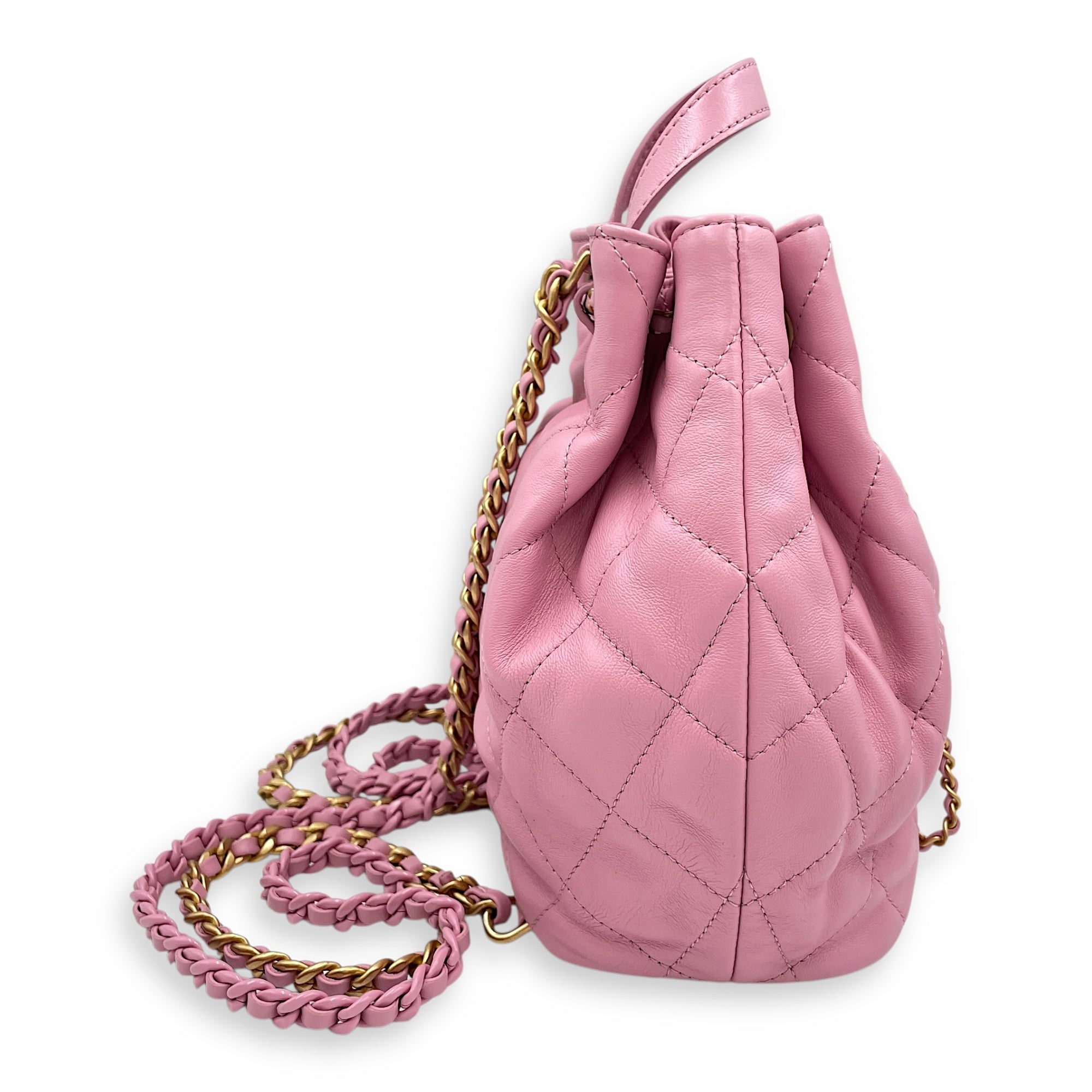 Quilted Drawstring Pink Backpack in Lambskin, Gold hardware