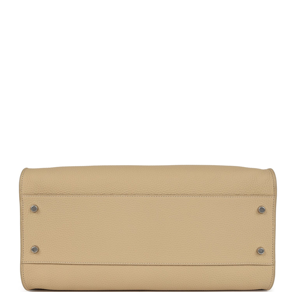 This Margaux 12 Shoulder Bag is in Boulder matte grained calfskin leather with silver hardware, featuring tonal stitching, elongated tubular handles, adjustable belted gusseted side panels, and an interior toggle closure.The interior is lined in Boulder calfskin and brown lambskin leather and has two interior card slots and one interior zip pocket.Origin: ItalyCondition: New and never worn (plastic on hardware)Accompanied by: Dustbag, carebookMeasurements: 14.25″ x 8″ x 6″; Top Handles: 10″