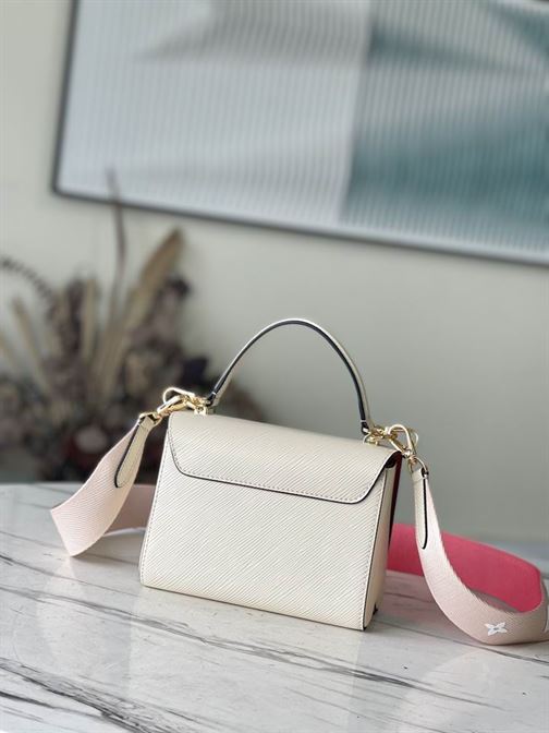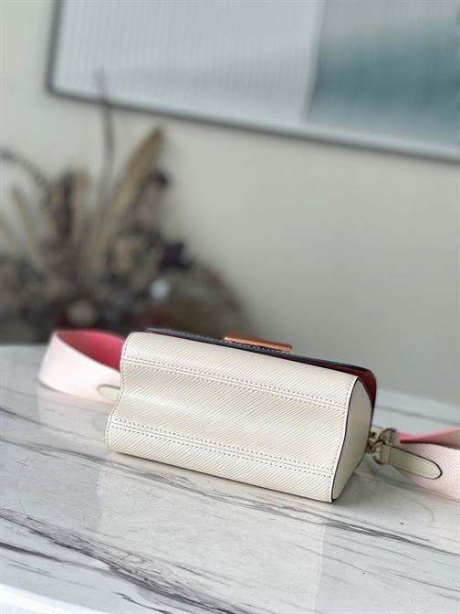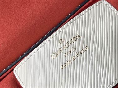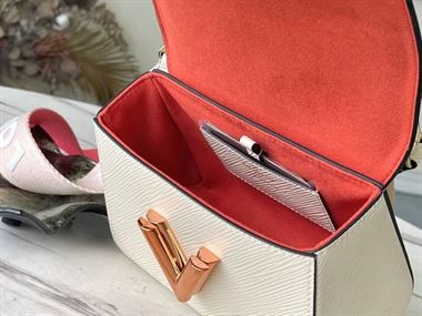 This Twist PM handbag Quartz White features a bold bright strap with “Louis Vuitton” 3-D printed on it in silicone. This bag has Epi grained leather and cowhide-leather trim.
