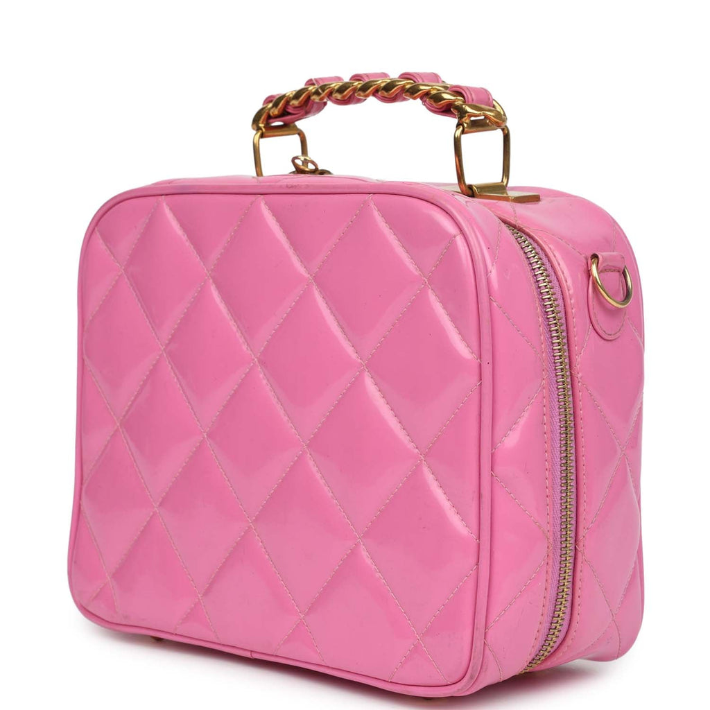 Vintage Chanel Lunchbox Vanity Bag Pink Patent Gold Hardware Shop for an authentic vintage Chanel Lunchbox Vanity Bag in pink patent leather with gold hardware in very good condition at Madison Avenue Couture.