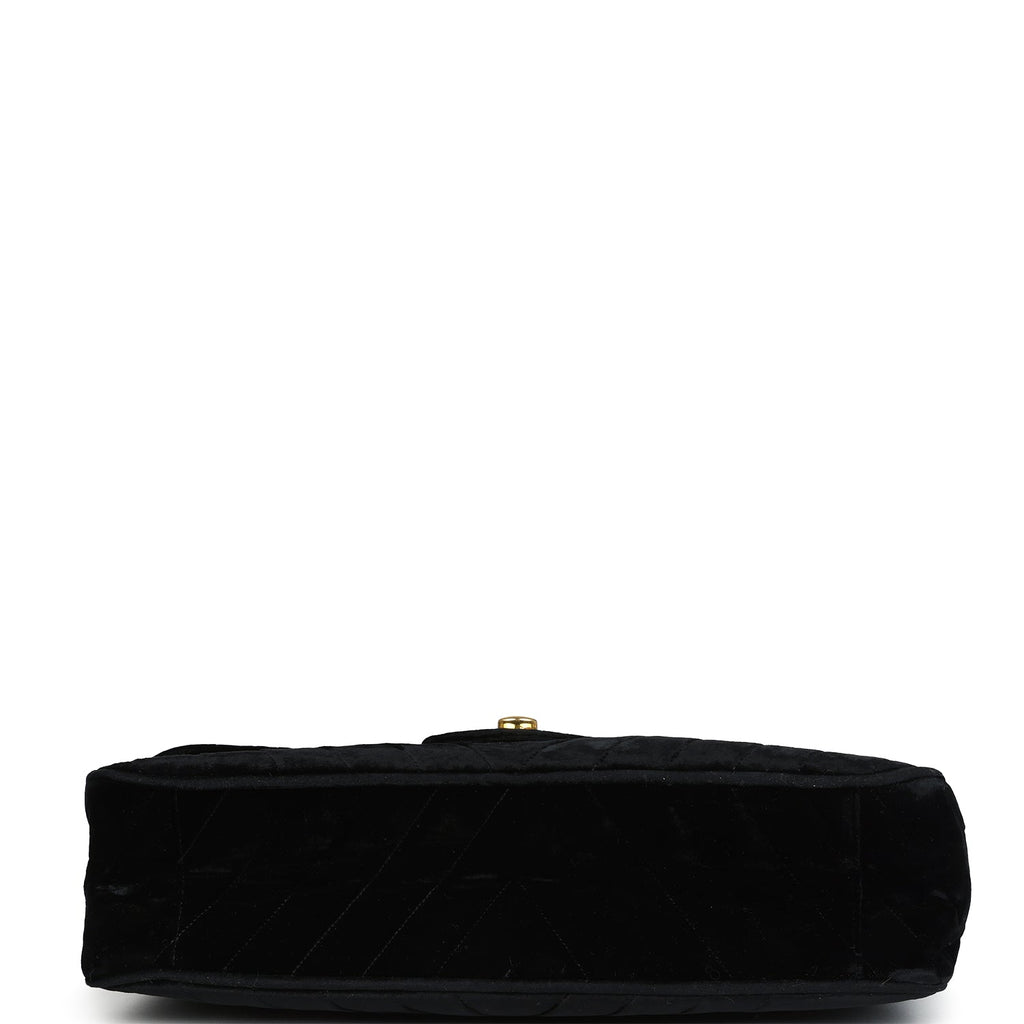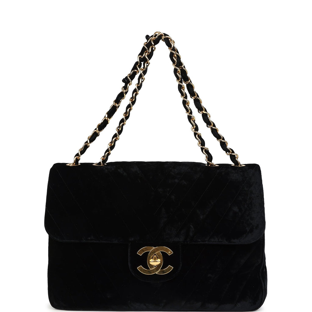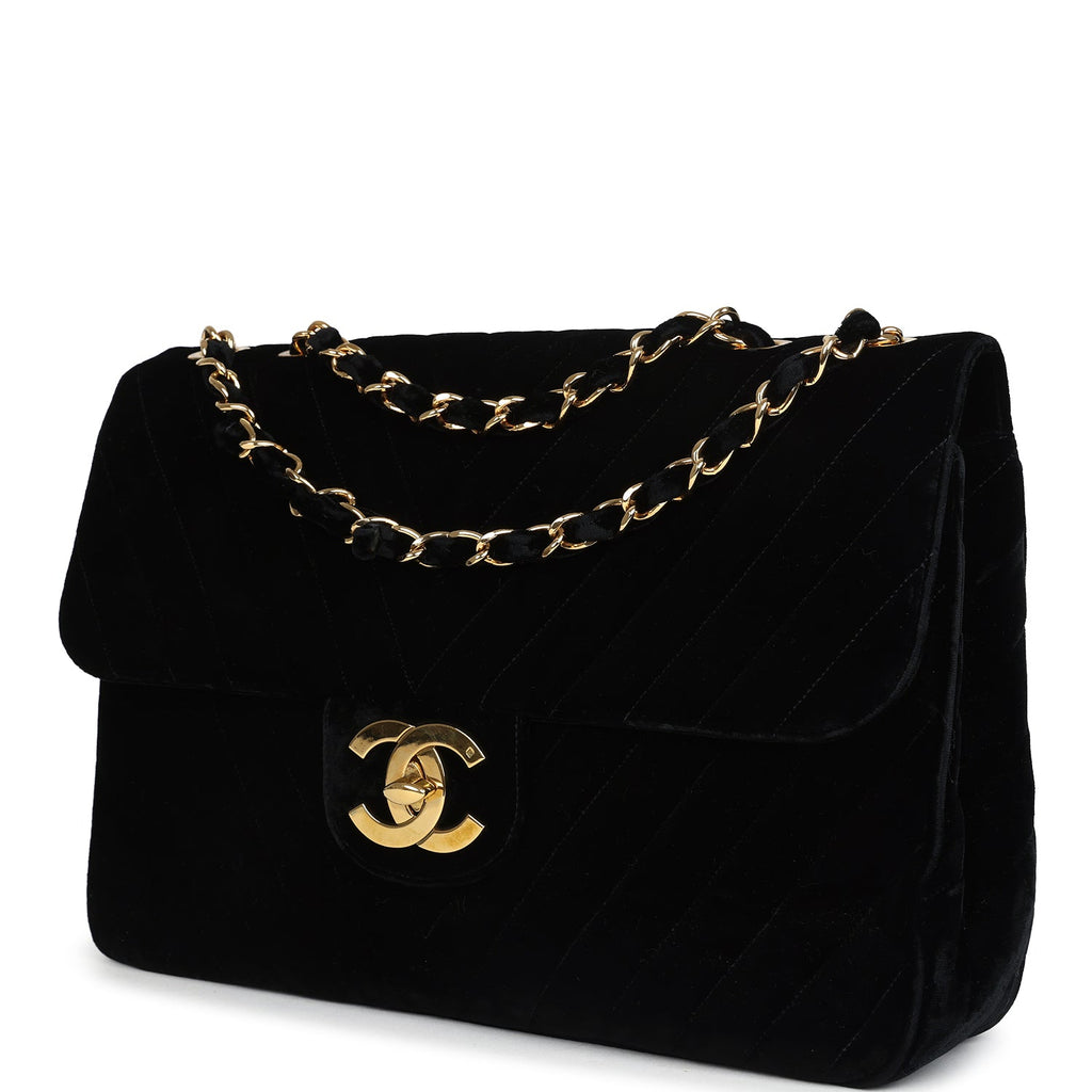 Vintage Chanel XL Classic Chevron Single Flap Bag Black Velvet Gold Hardware Shop for an authentic vintage Chanel XL Chevron Single Flap Bag in black velvet and gold hardware in excellent condition at Madison Avenue Couture.