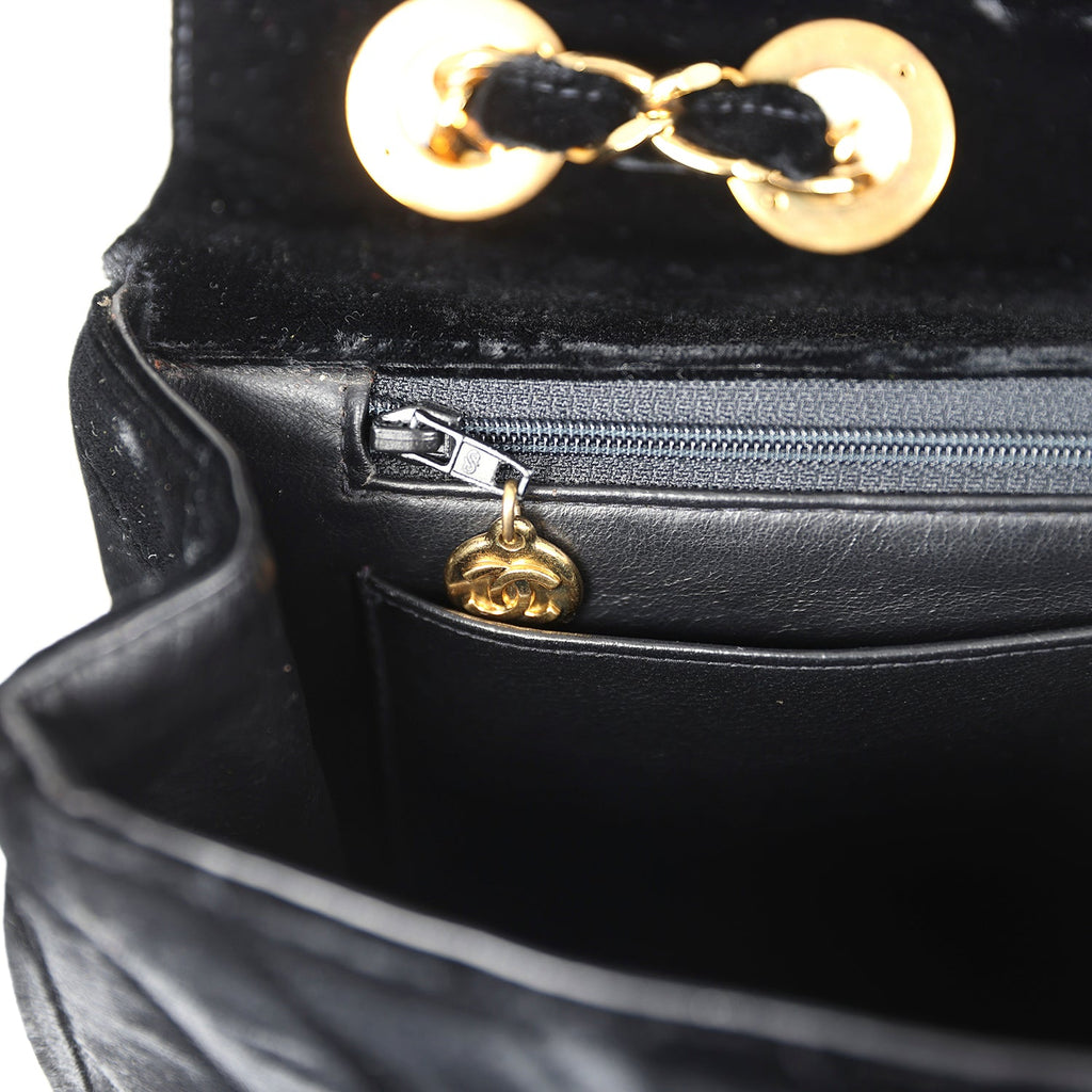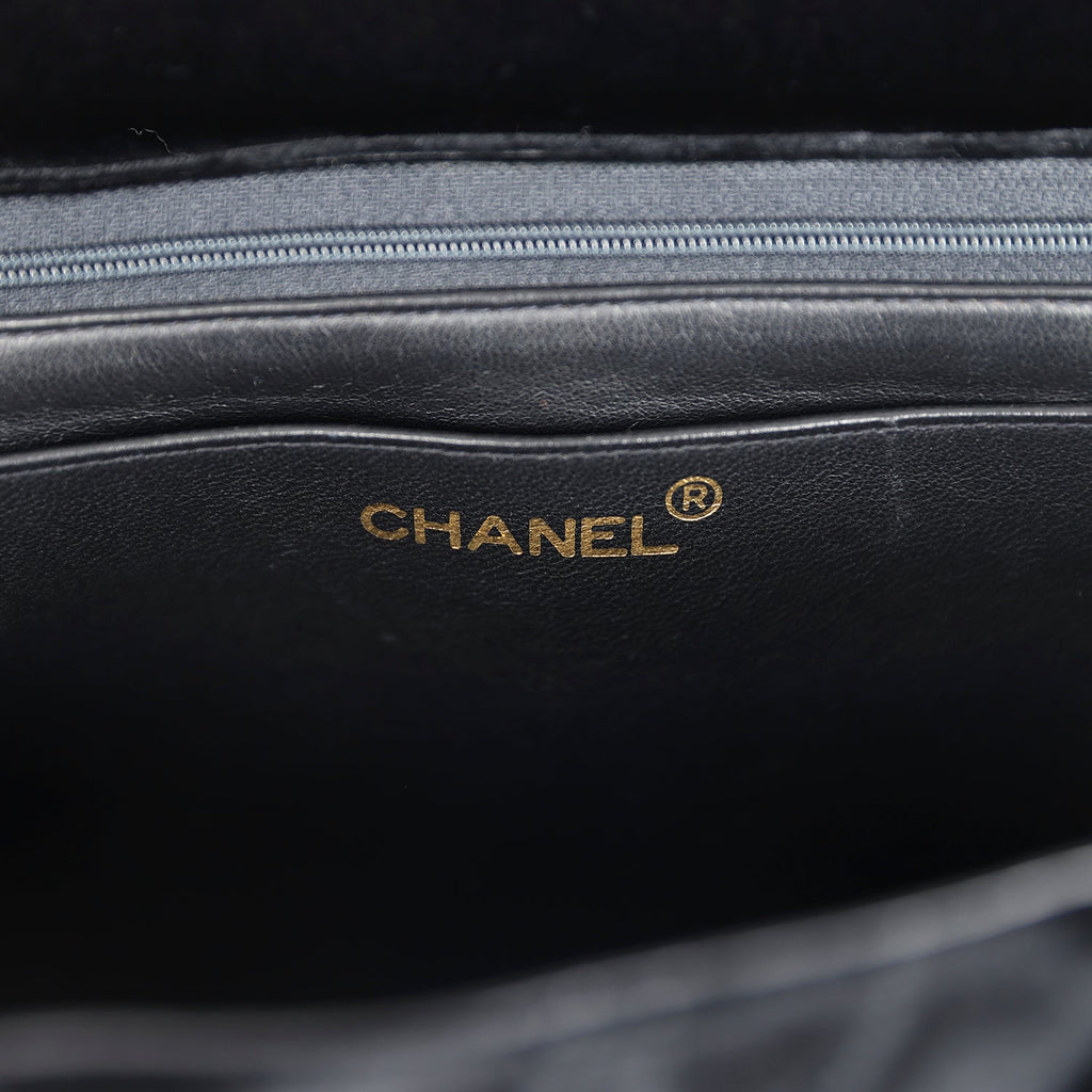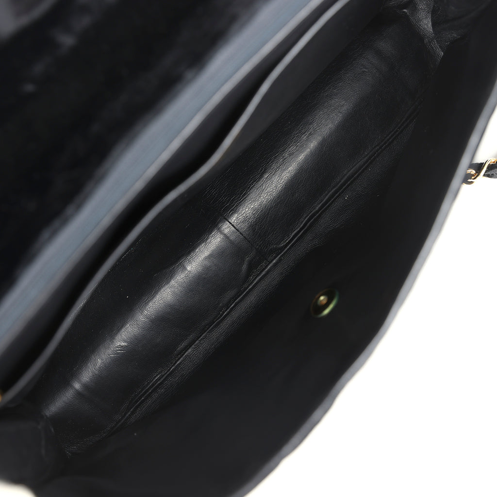 This vintage Chanel XL Chevron Quilted Single Flap Bag is in black velvet fabric with gold hardware, a front flap with a signature oversized CC interlocking closure, a back exterior pocket, and an interwoven gold plated chain link and black velvet shoulder/crossbody strap.The interior is lined in black leather and includes one zip pocket and a slip pocket underneath on the rear wall.Collection: 2 Series (1991 -1994)Origin: FranceCondition: Vintage; Excellent – This bag is relaxed in shape structure along the sides and bottom. There is no plastic on the hardware. There are visible scratches to the CC turnlock hardware. The exterior velvet fabric is clean overall with minor rubbing to bottom corners and back edging trim. There is minor rubbing to the shoulder strap fabric. The interior base is curved inward instead of lying flat. The interior leather has creasing throughout. The date stamp sticker is legible and still intact.Accompanied by: Chanel dustbag, COA card, carebookMeasurements: 14” width x 10″ height x 3.5″ depth; 23″ shoulder drop (12″ doubled)