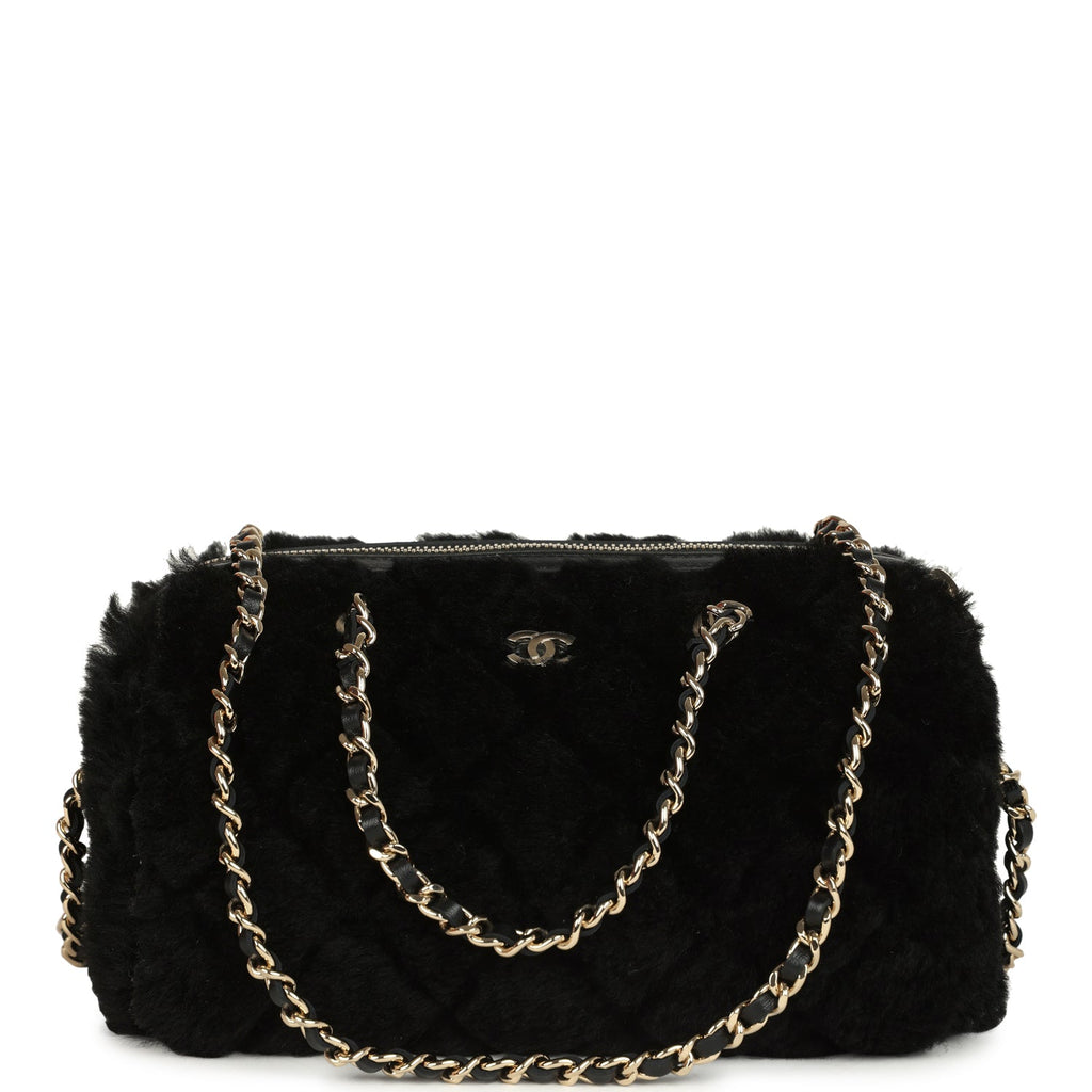 Chanel Mini Timeless Classic Barrel Bag with Chain Black Shearling Light Gold Hardware